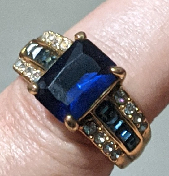 A beautiful ring featuring a large, square-cut blue stone surrounded by smaller stones. The band appears to be a gold-tone band It's in excellent condition and ready for a new home!