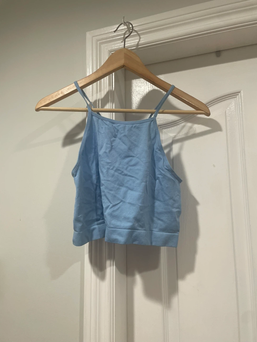 A simple light blue tank top, perfect for layering or wearing on its own. It's in great condition and ready for a new home