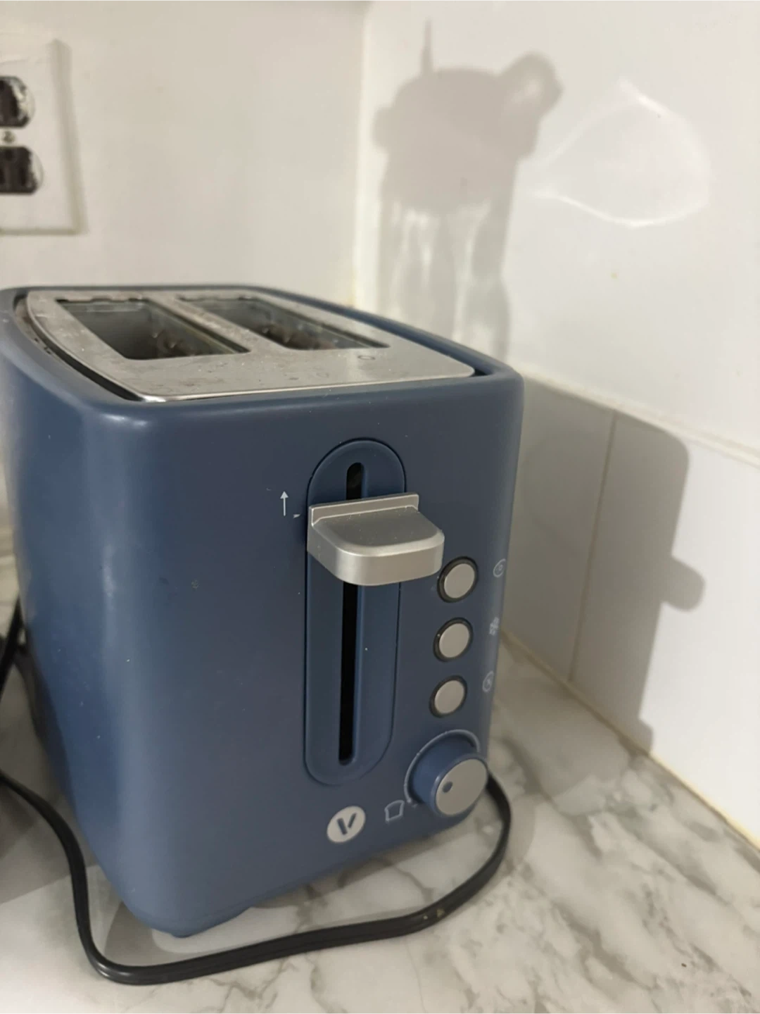 Selling a blue toaster in good condition! It has a few settings and is ready to make some toast