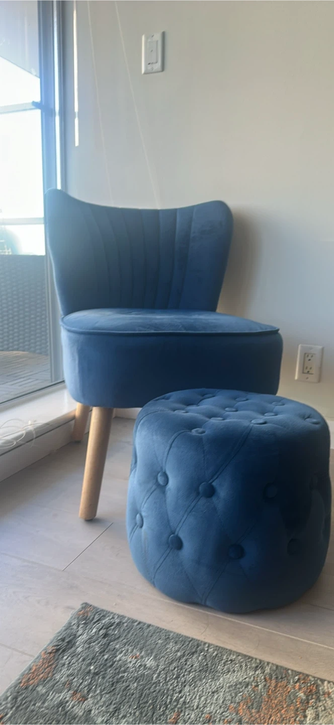 Selling a cute blue velvet accent chair with a matching ottoman. It's in great condition and would be perfect for a bedroom or living room. The velvet material is soft and comfortable, and the colour is a beautiful shade of blue. It's a stylish and functional piece of furniture