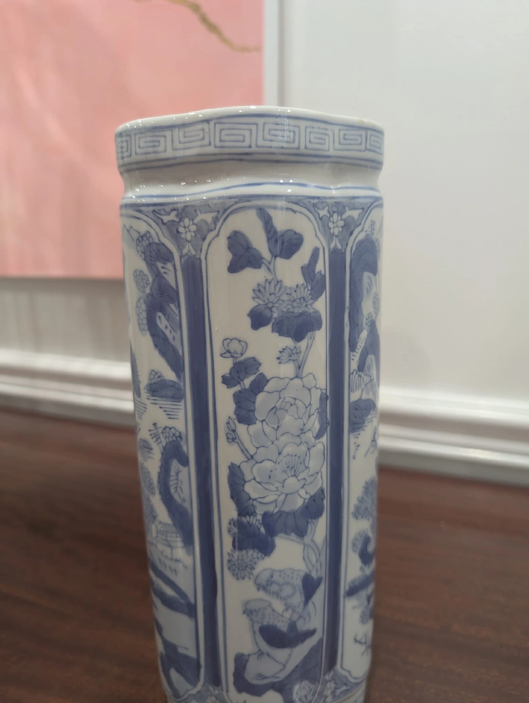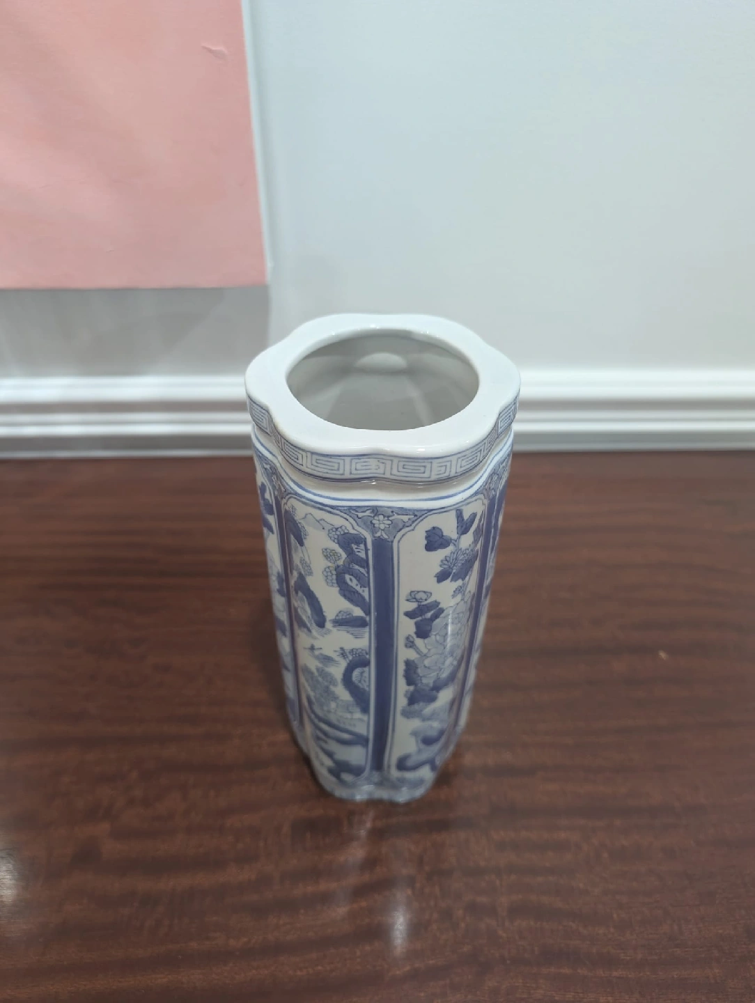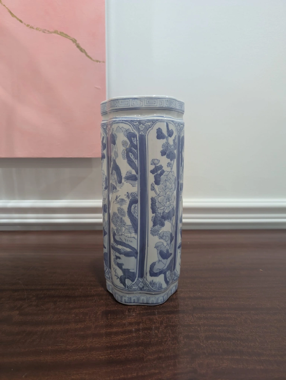 Here's a lovely blue and white ceramic umbrella stand or vase! It's in great shape and features a beautiful floral design. It's about 10 inches tall.