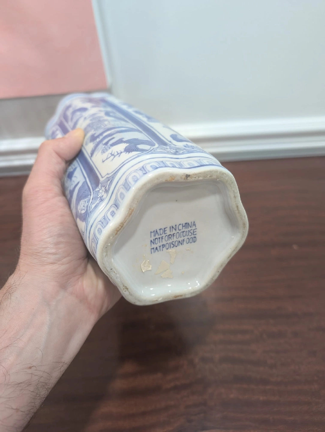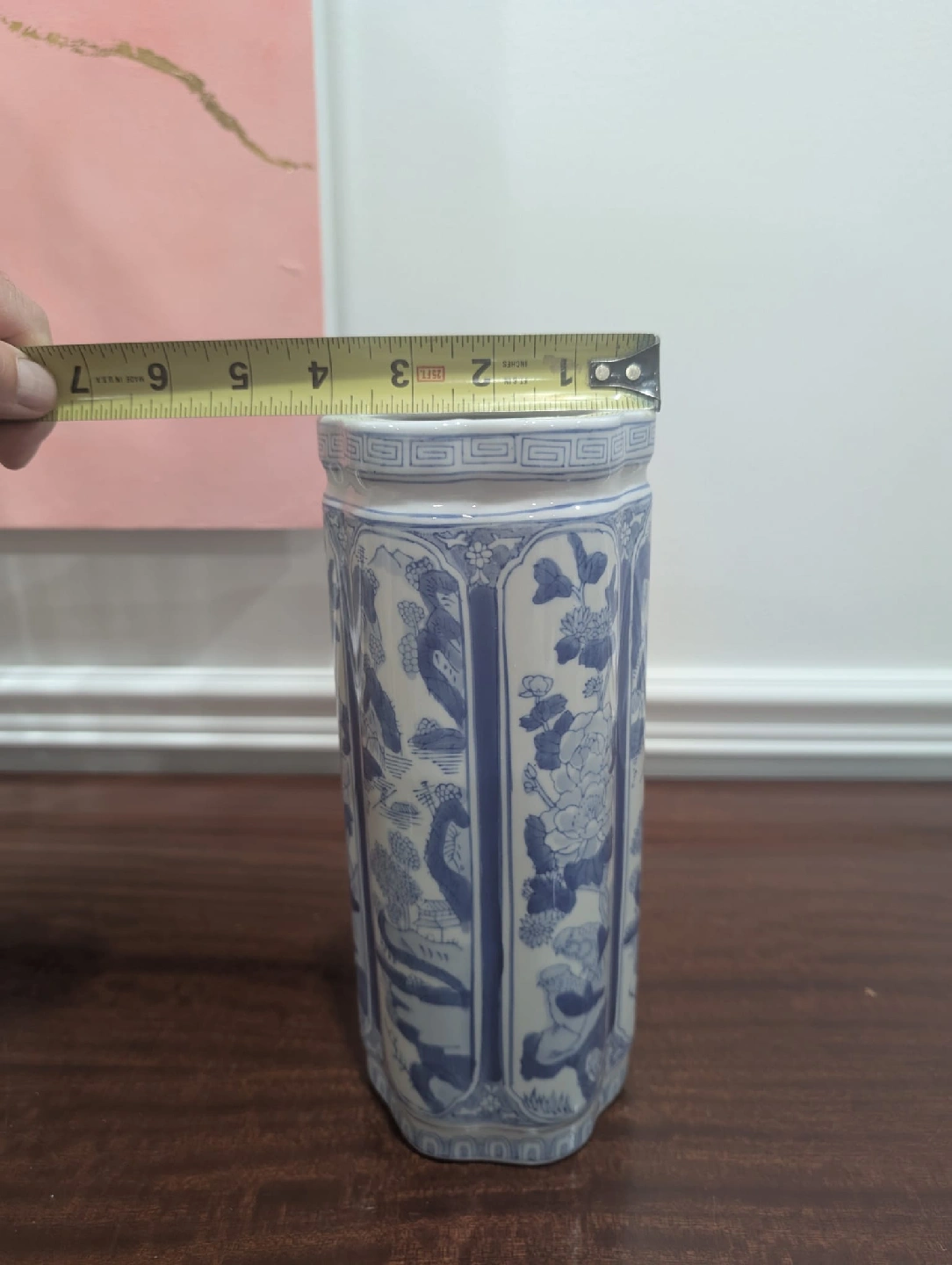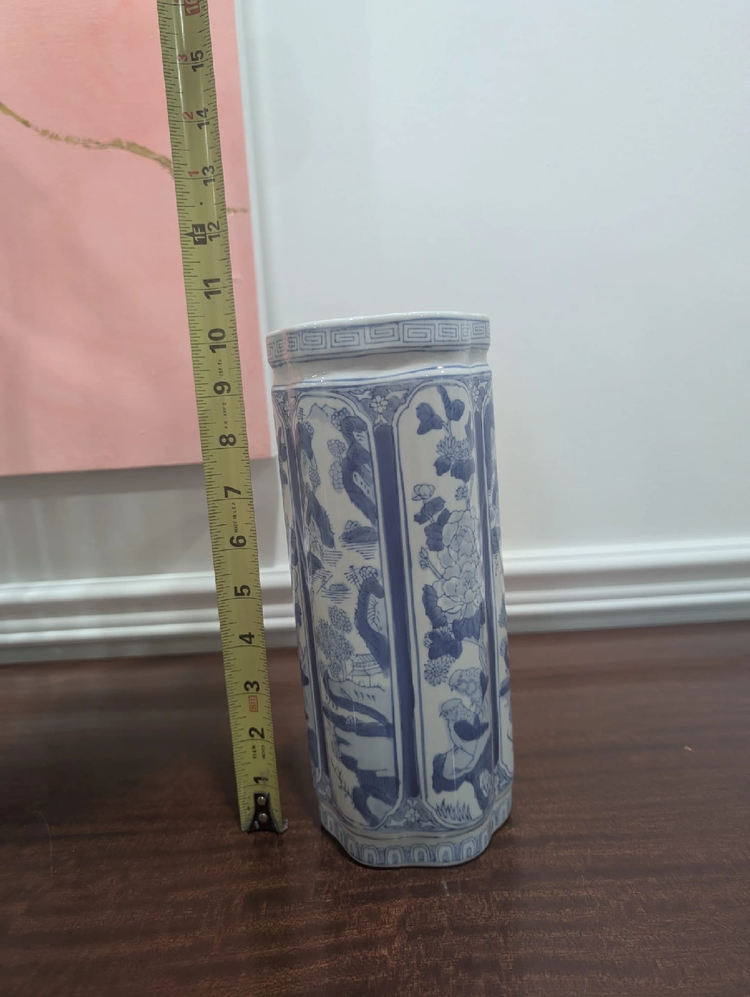 Here's a lovely blue and white ceramic umbrella stand or vase! It's in great shape and features a beautiful floral design. It's about 10 inches tall.