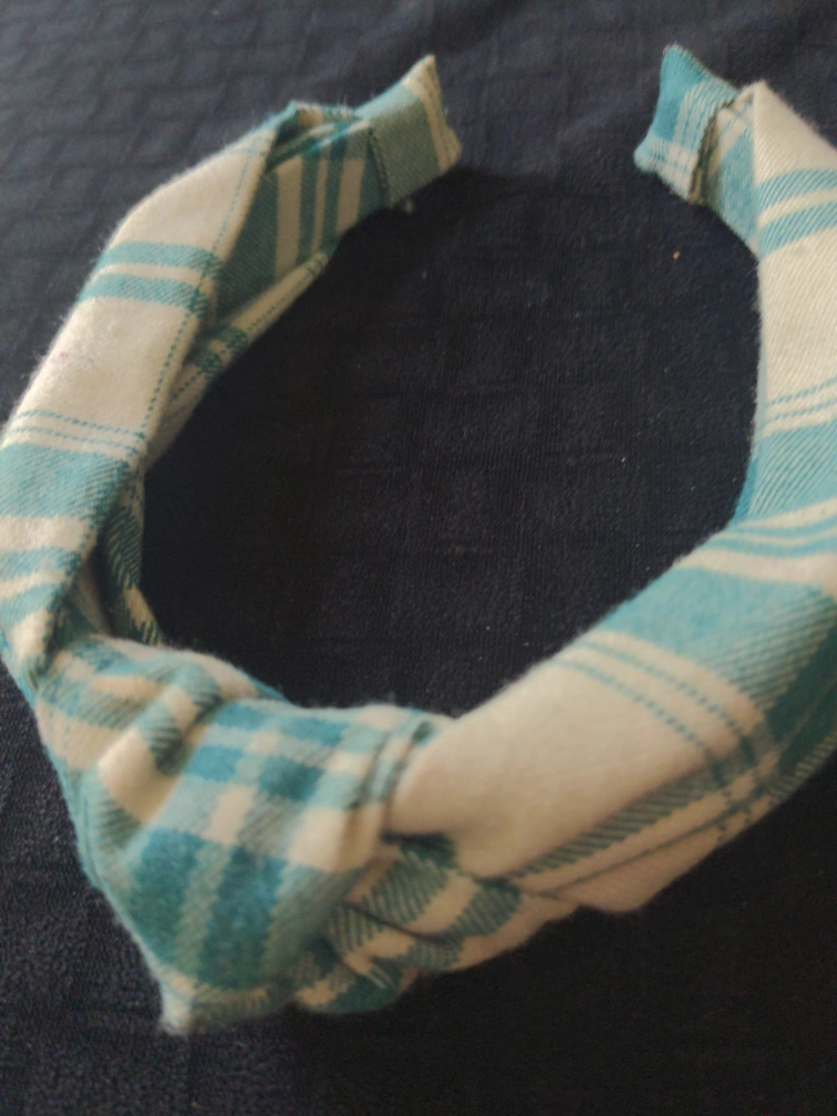A cute, fabric-covered headband with a blue and white plaid pattern! It's in great condition and ready to add a pop of colour to your outfit