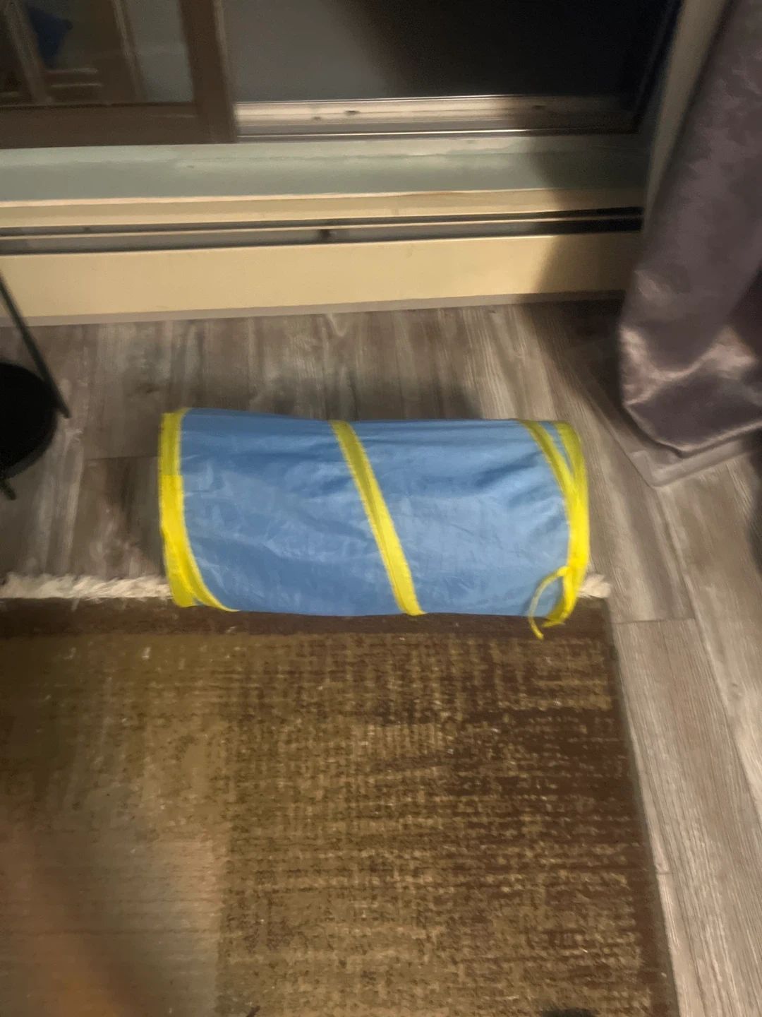 Here's a fun cat tunnel! It's blue with yellow trim. Your cat will love playing in this!