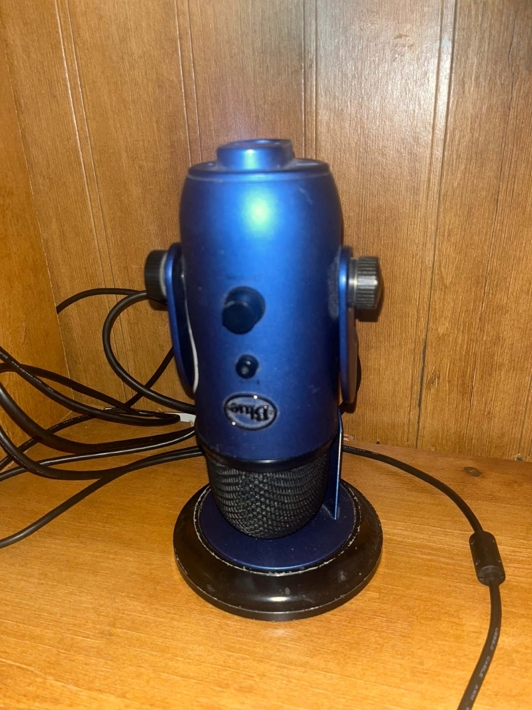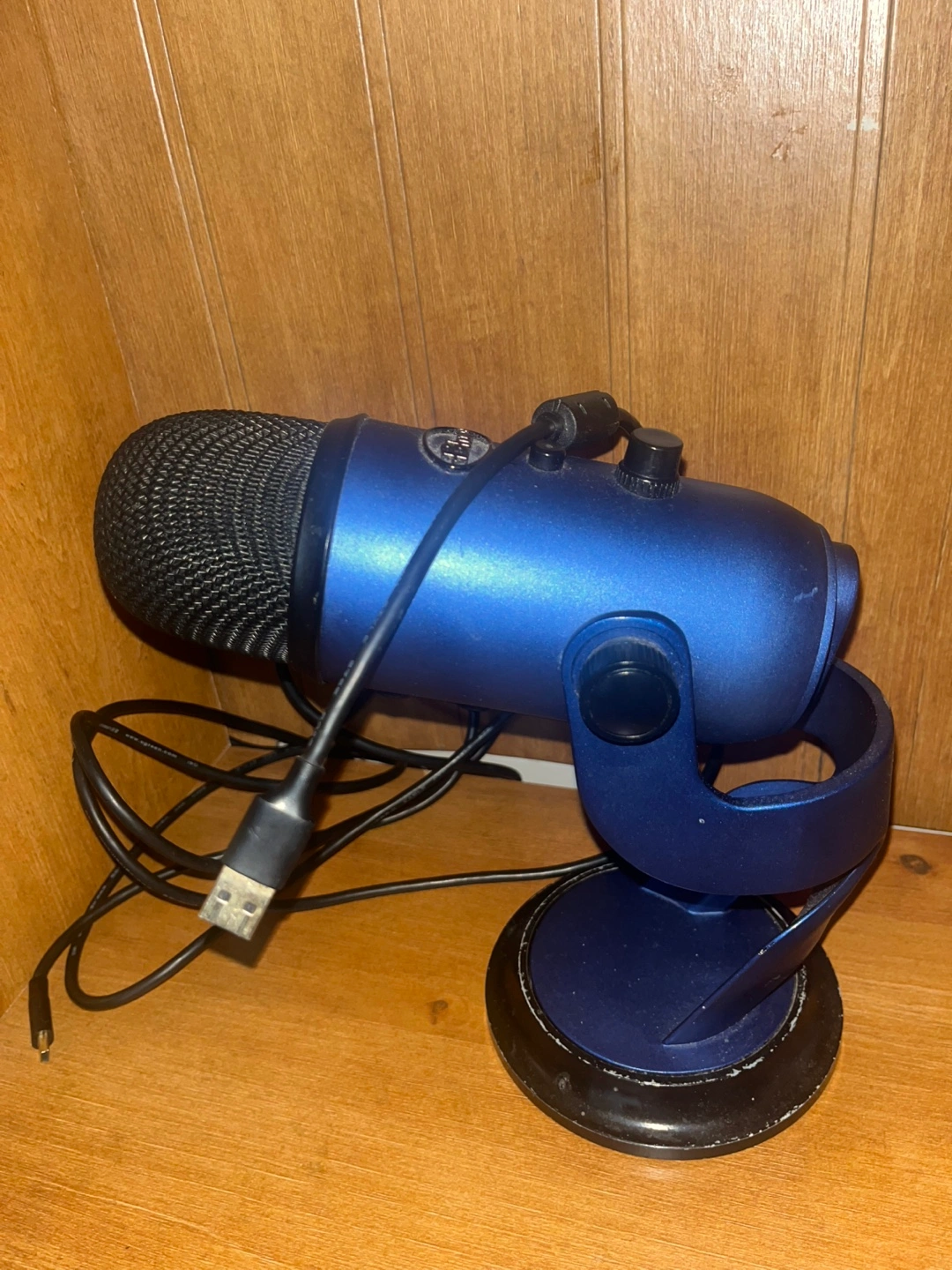 Selling a Blue Yeti USB microphone in blue! It's in Good shape and had it for one year. Perfect for podcasts, streaming, or recording music