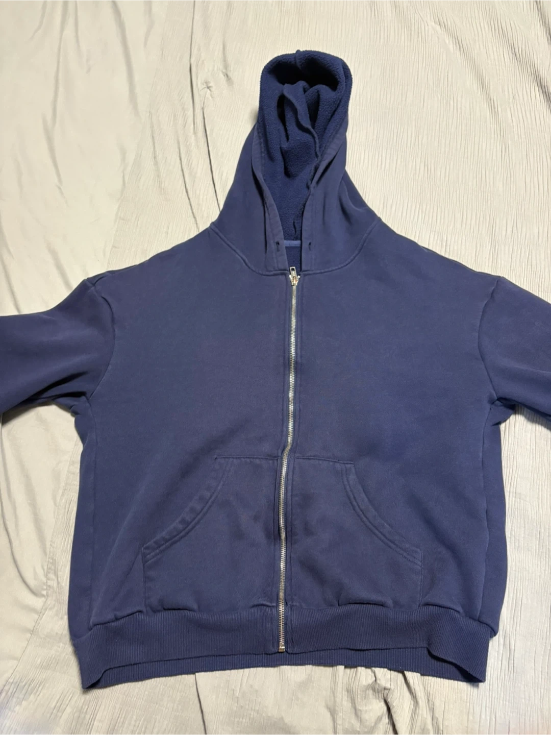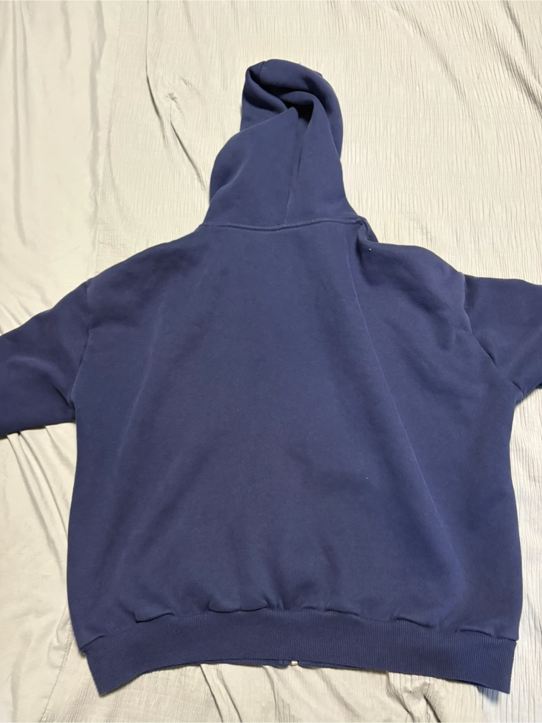 Selling a cozy, blue zip-up hoodie. It's in great condition and perfect for layering on those cooler days. The hoodie features a full zipper and front pockets, making it both practical and stylish. It's a comfortable fit and ready for a new home!