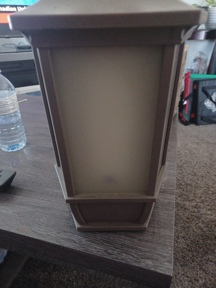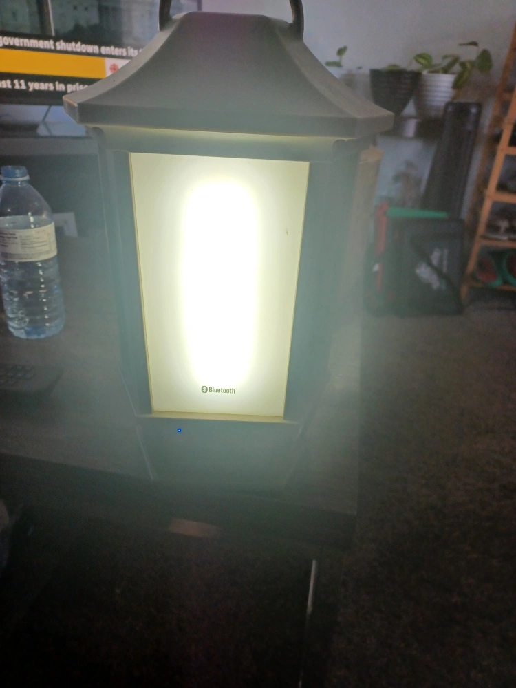 This outdoor lantern features a Bluetooth connection. It gives off a warm, inviting glow, perfect for patios or decks. It's in great condition and ready to light up your outdoor space missing charge cord