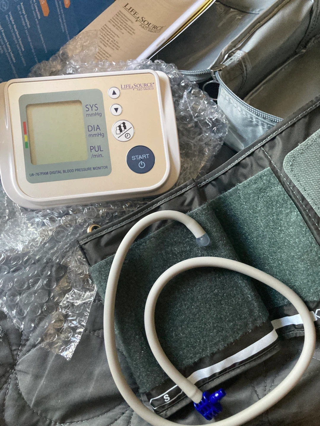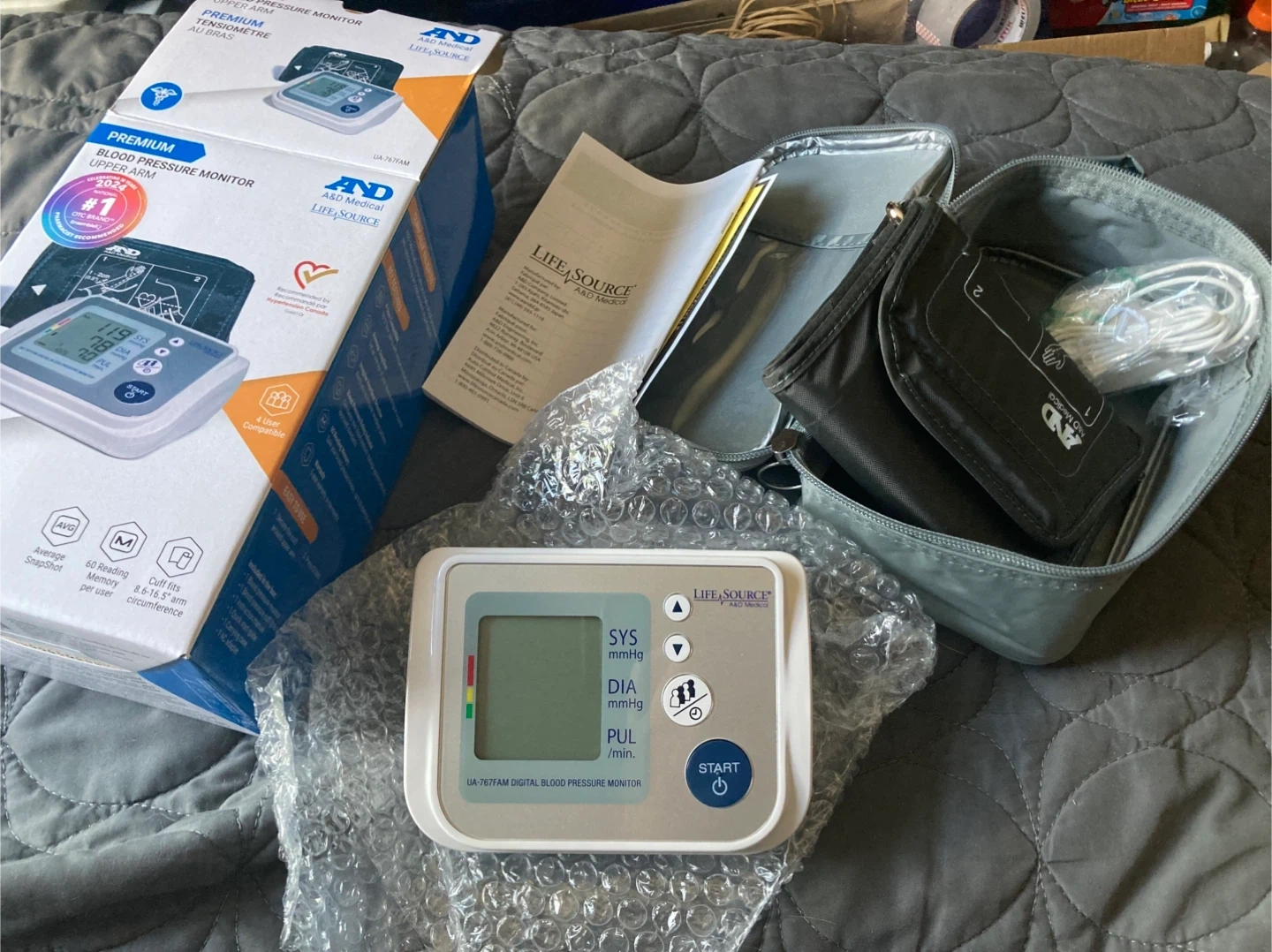 Brand new in box still, LifeSource Premium Blood Pressure Monitor. Recalls the last 90 readings and can track multiple people. Blood pressure rate indicator, has irregular heartbeat detection. This monitor is regular $115 with tax in stores but Im only asking $35 firm