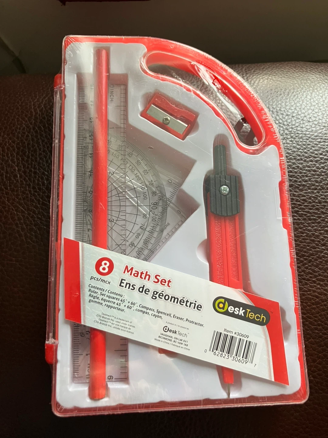 Selling a brand new, still-in-packaging DeskTech 8-piece math set! Perfect for students or anyone needing precise measurements and angles. Includes a compass, ruler, protractor, and more, all in a handy red carrying case Pick up on Gladstone St & 34th E Ave, Vancouver