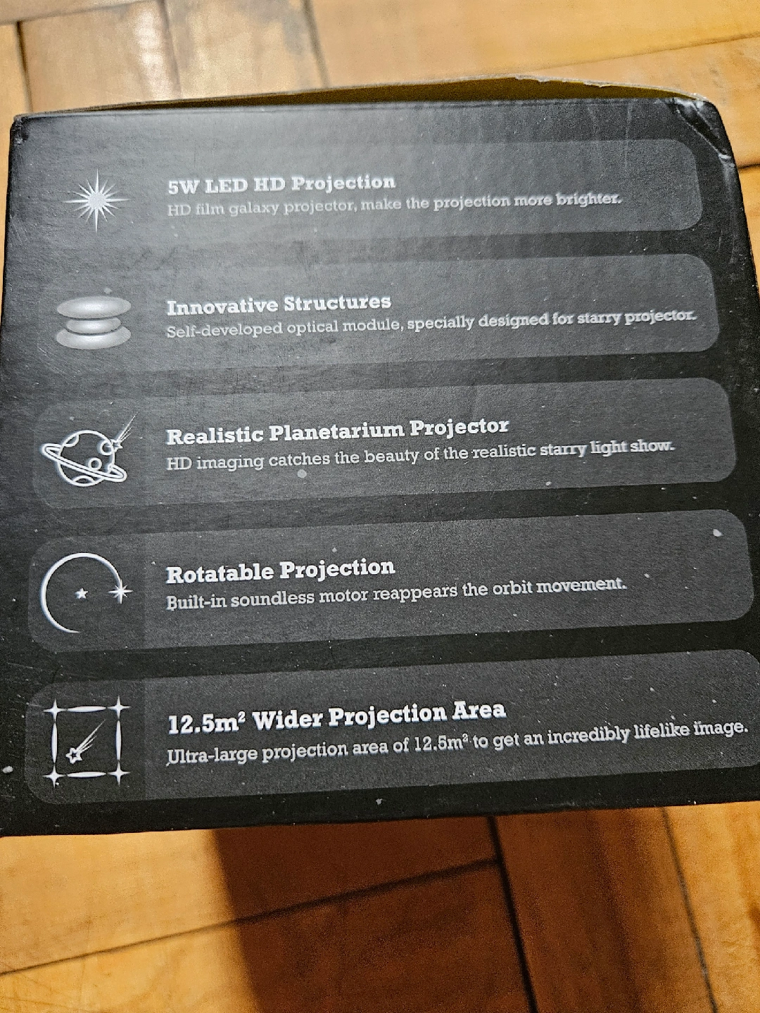 Brand new in Box! Bring the beauty of the starry night sky into your home with this Galaxy Projector! It features: - 5W LED HD Projection for brighter images - Innovative Structures with a self-developed optical module - Realistic Planetarium Projector for HD imaging - Rotatable Projection with a built-in soundless motor - 12.5m² Wider Projection Area for a lifelike image - Adjustable Angle - 12 Film Discs Built-in It's perfect for creating a relaxing and immersive atmosphere in any room! Please Contact Thanks