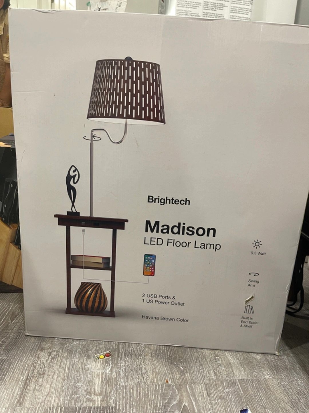 Selling a never opened- brand new in box-Brightech Madison LED Floor Lamp in Havana Brown colour. This lamp features: - 2 USB Ports & 1 US Power Outlet - Built-in End Table & Shelf - Swing Arm - 9.5 Watt