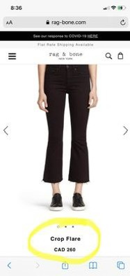 Cute and stretchy, premium black jeans. Built to last, very trendy, and perfect for any season! Definitely a rare fashion find. Unfortunately have to let go because I got the wrong size. WANT GONE! Size: 24 Original price: $260 CAD (Website: https://www.rag-bone.com/womens/jeans/crop-flare-W1594K502BCO.html) PRICE NOW: $60 Pick up only. E-transfer only.