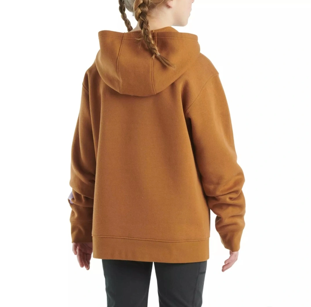 Carhartt Junior Girls Large (12-14) Fleece Graphic Hoodie. It features the Carhartt logo on the sleeve and a classic kangaroo pocket. The warm brown colour is perfect for fall and winter. Great for layering or wearing on its own!