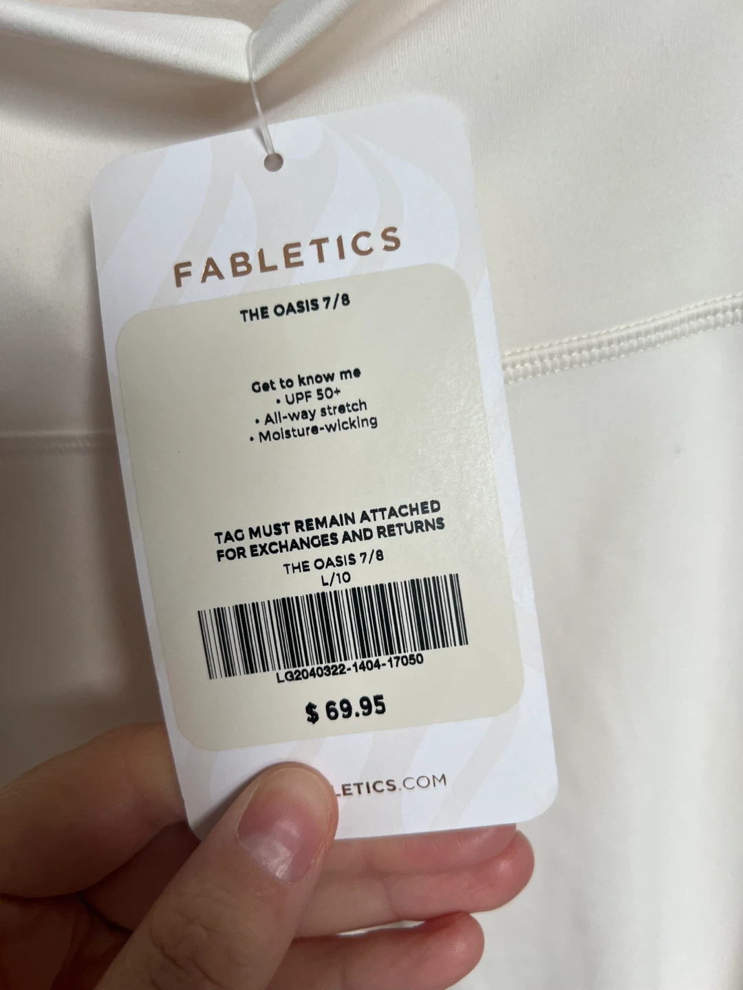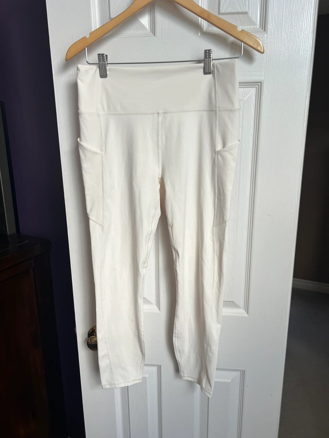 Selling a pair of Fabletics The Oasis 7/8 leggings in size L. They are a lovely off-white colour and feature UPF 50+ protection, all-way stretch, and moisture-wicking fabric! Originally bought for $69.95