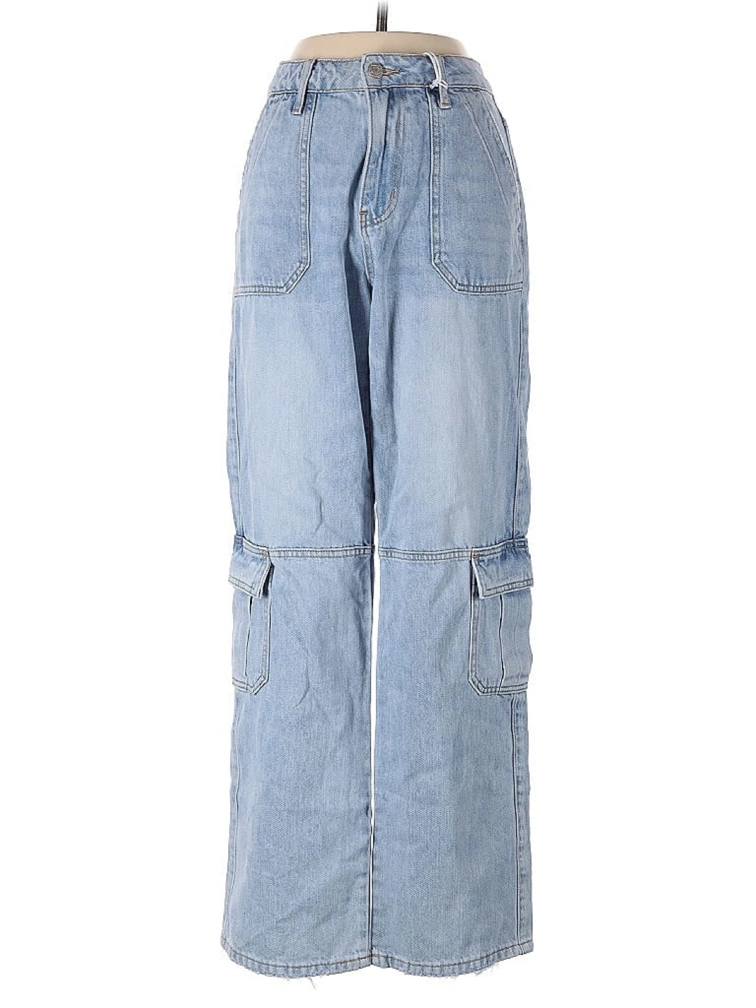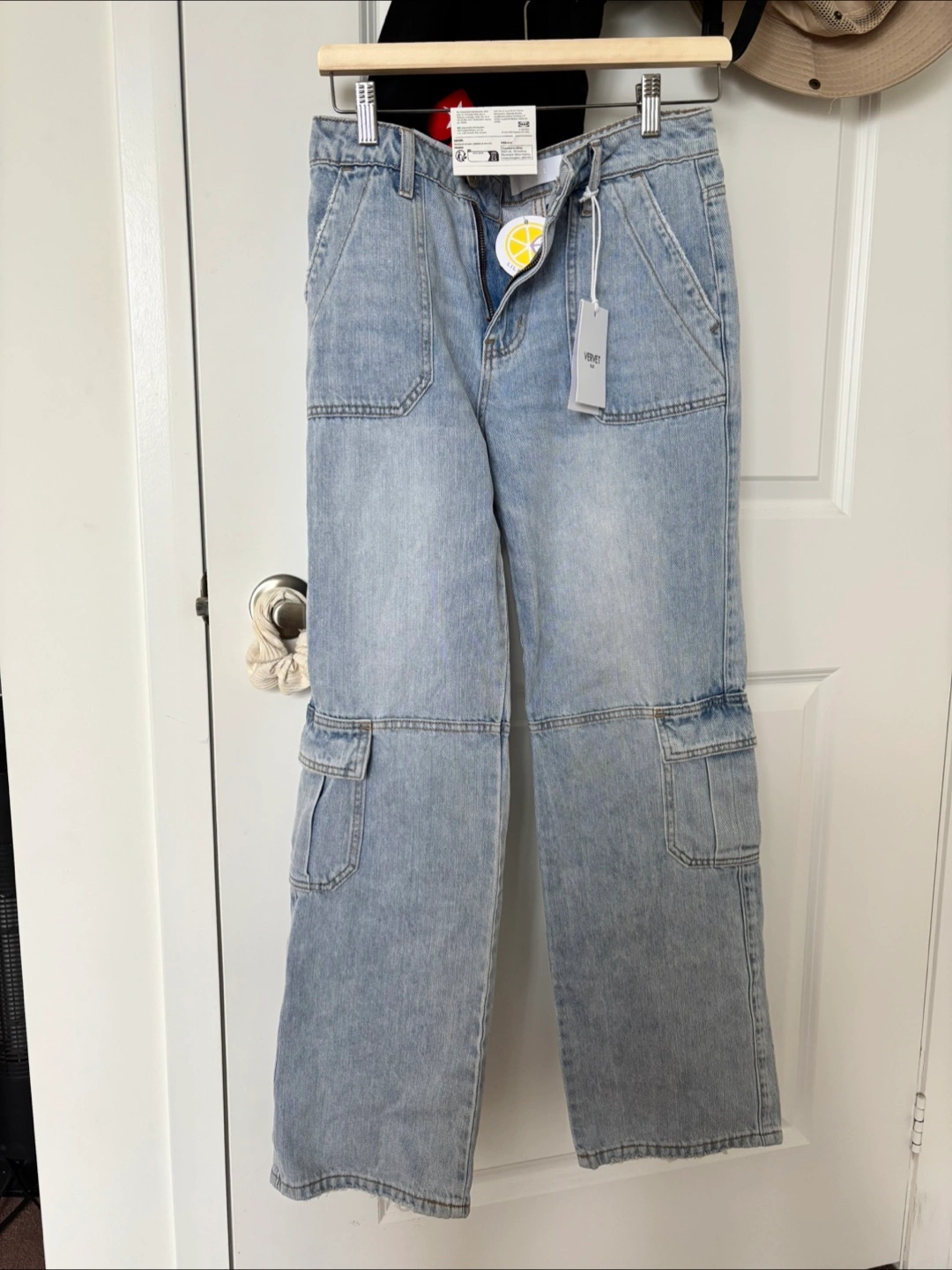 Light wash blue denim cargo jeans. Features multiple pockets. Size 6. Waist 23", rise 11", inseam 32". BNWT Original price over 90USD