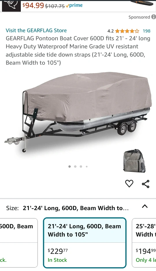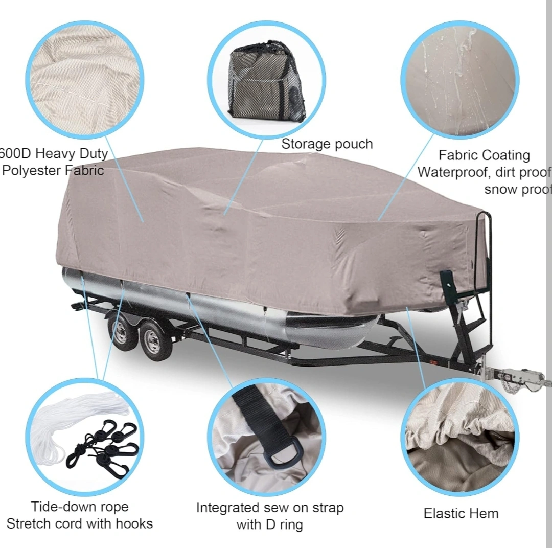 BNIB Brand New In Box Fits 21' - 24' long boat Maximum beam width: 105" Made of durable 600D PU coated polyester outer surface material for maximum protection against rain, snow, sand and UV Integrated straps with D rings on each side of boat cover for easy fitting and trailering Comes with tide-down rope to hold the cover in place Elastic Hem with sew-in elastic cord for custom fit for different boat shapes Comes with storage bag ***Please Check Out My Other Ads