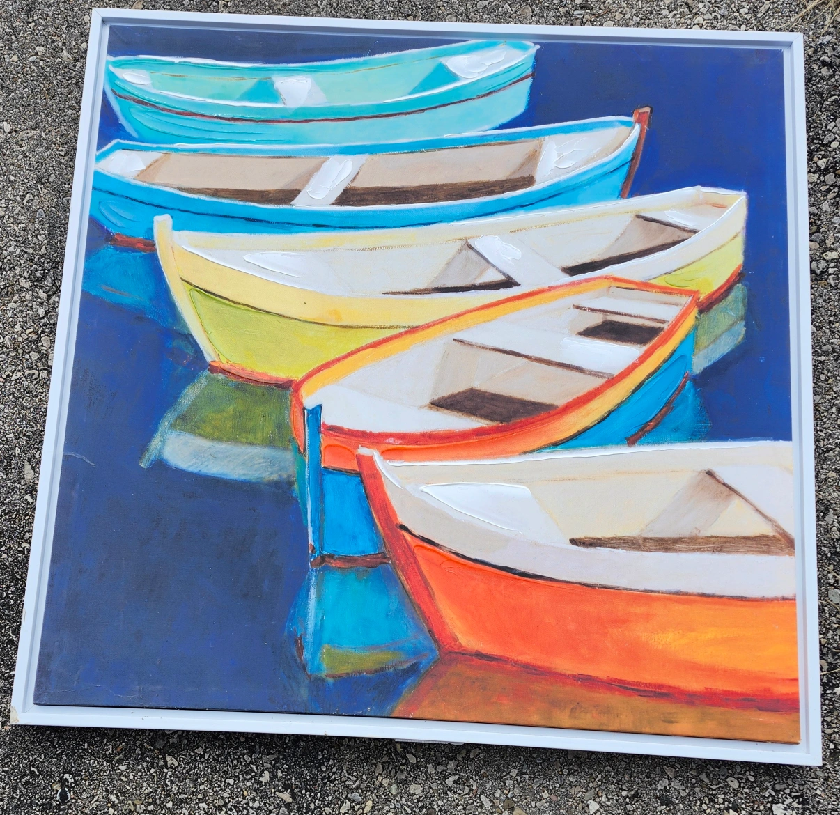 I'm selling a vibrant painting of boats in the water, framed in white. It's 30x30 inches and 1.5 inches wide - perfect for adding a pop of colour to any room.