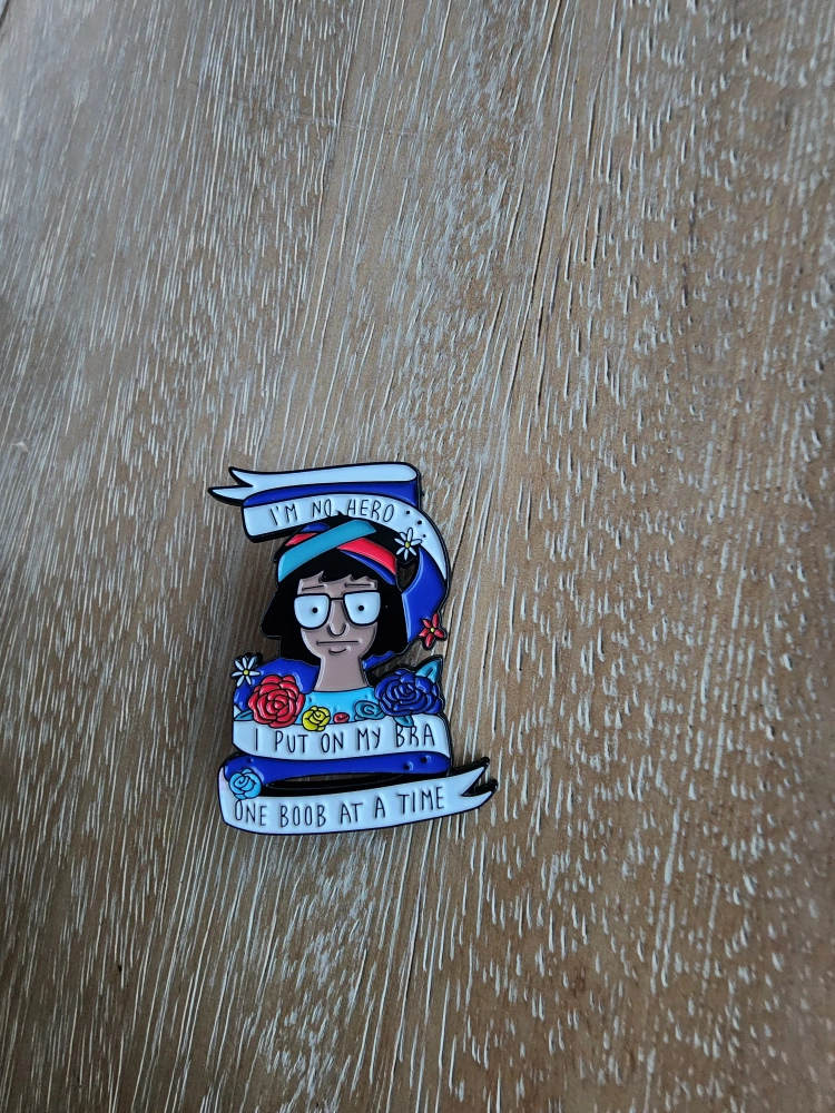 Selling a Bob's Burgers enamel pin featuring Tina Belcher! It says "I'm no hero, I put on my bra one boob at a time"