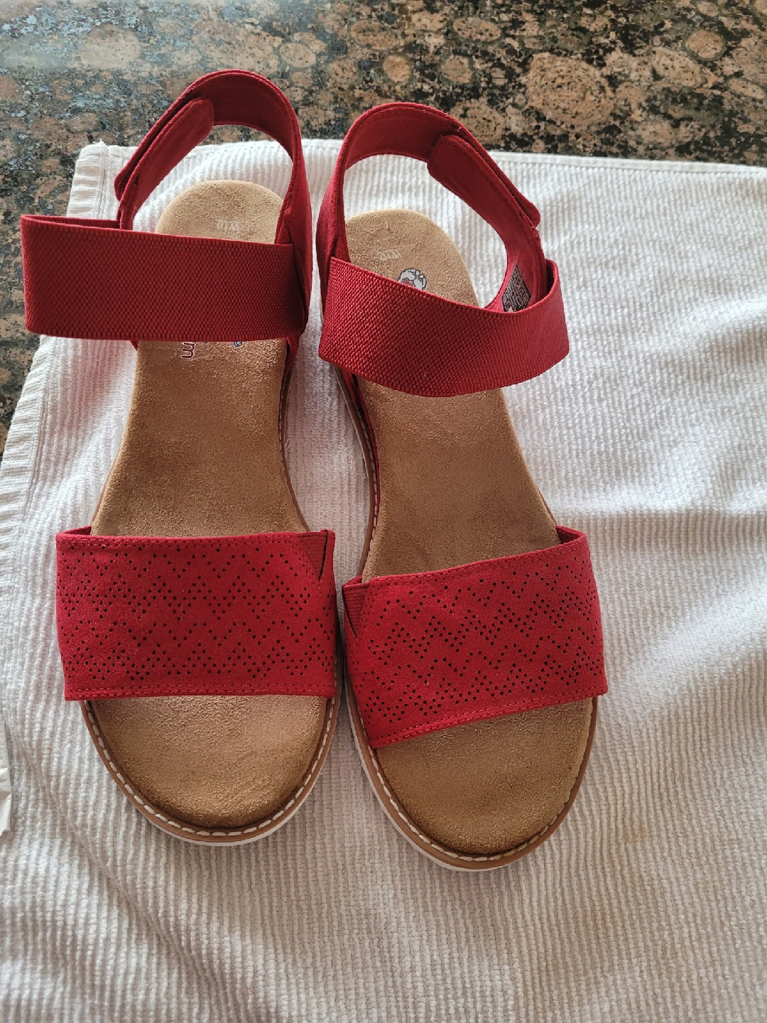 These are Bobs by Skechers memory foam sandals in a vibrant red colour! They're a women's Size 10. Perfect for adding a pop of colour to your summer wardrobe