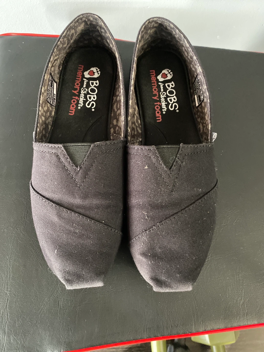 Comfy pair of BOBS from Skechers flats in size 7! They feature a memory foam insole for extra comfort. The colour is black and they are in good condition.