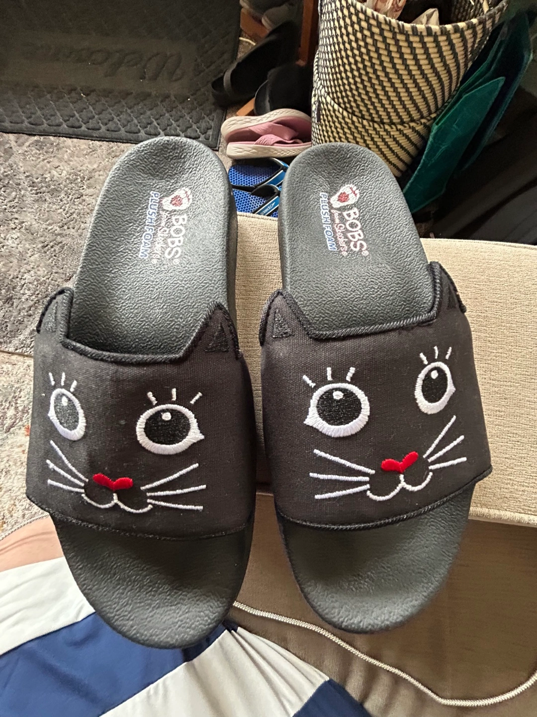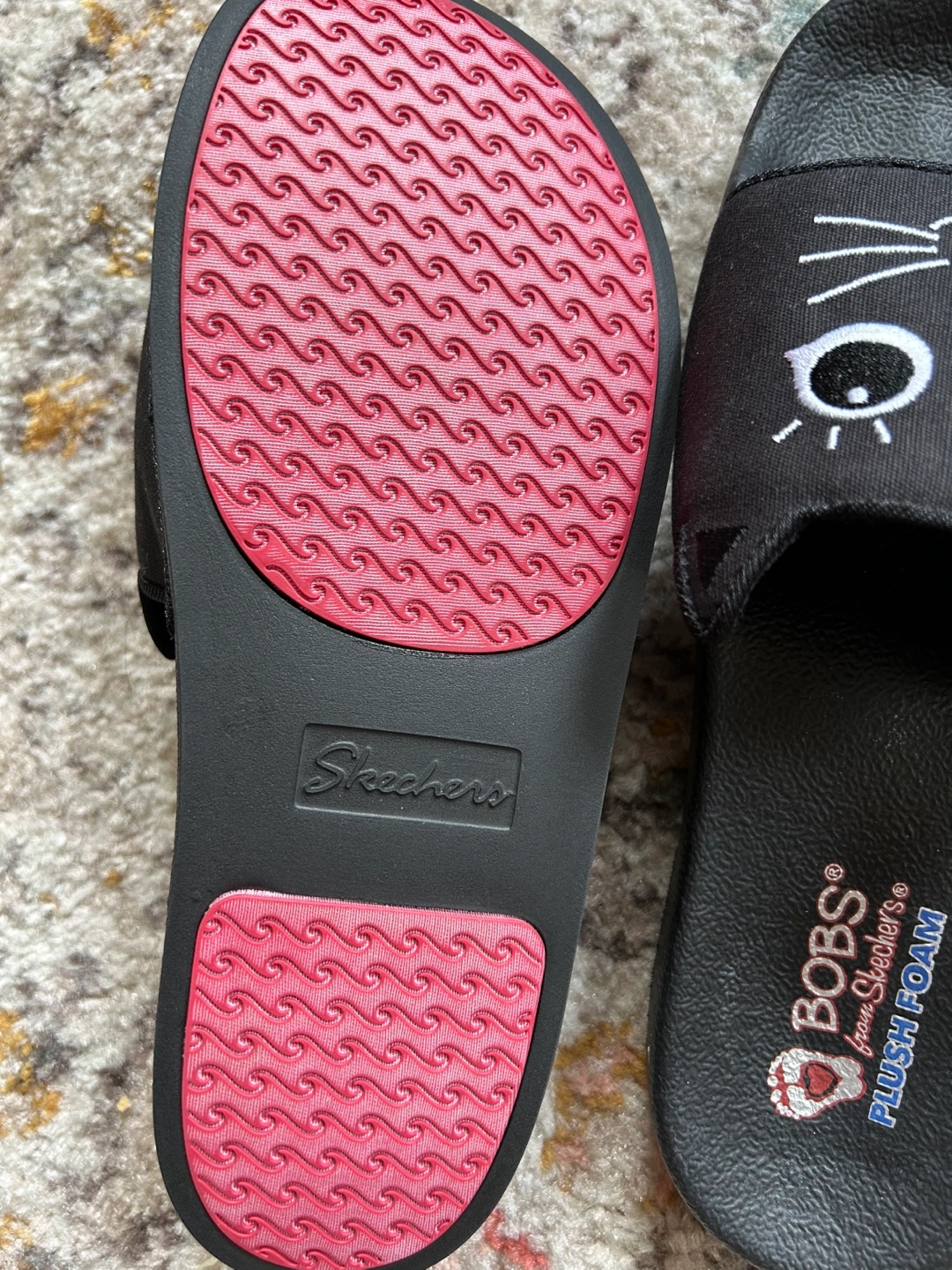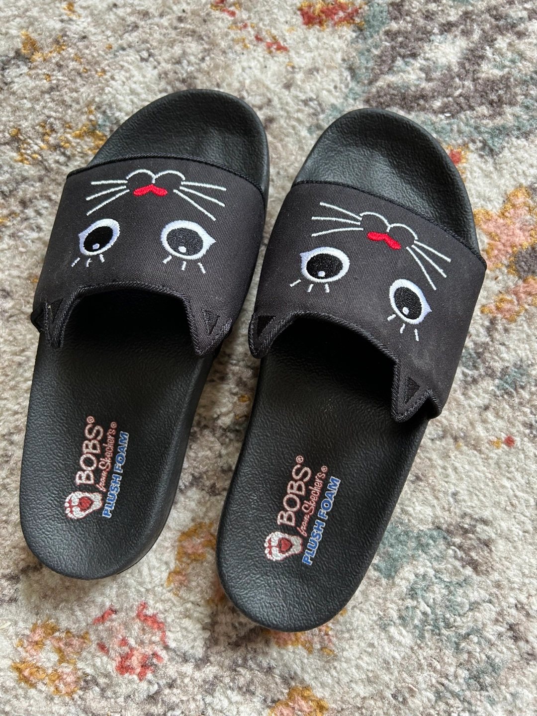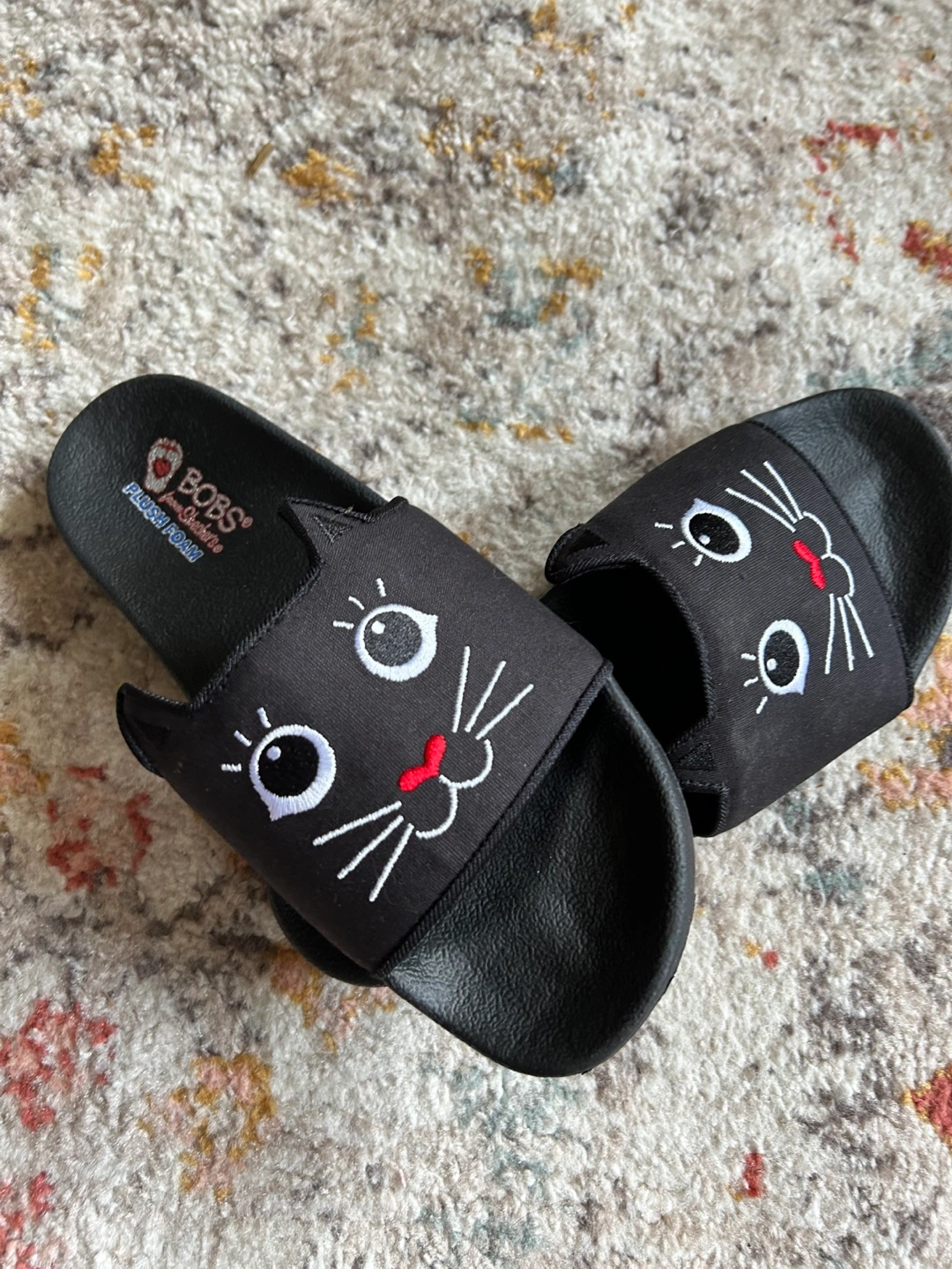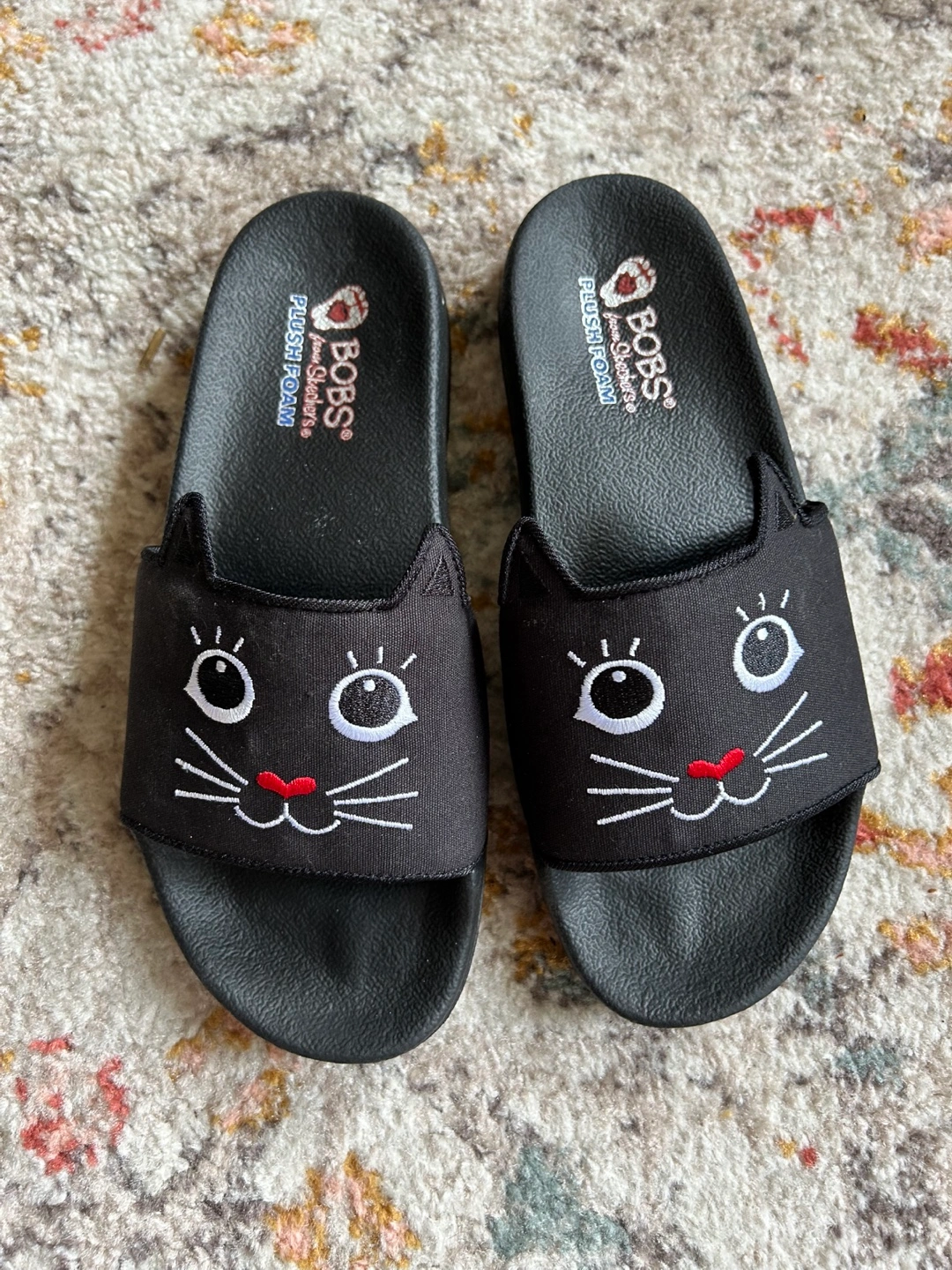 These adorable BOBS from Skechers slides feature a cute cat design! They're super comfy with plush foam and perfect for lounging around the house or a quick trip outside. The soles are a stylish red colour.