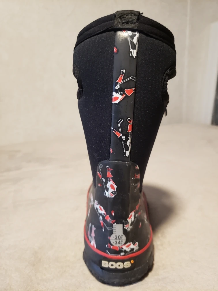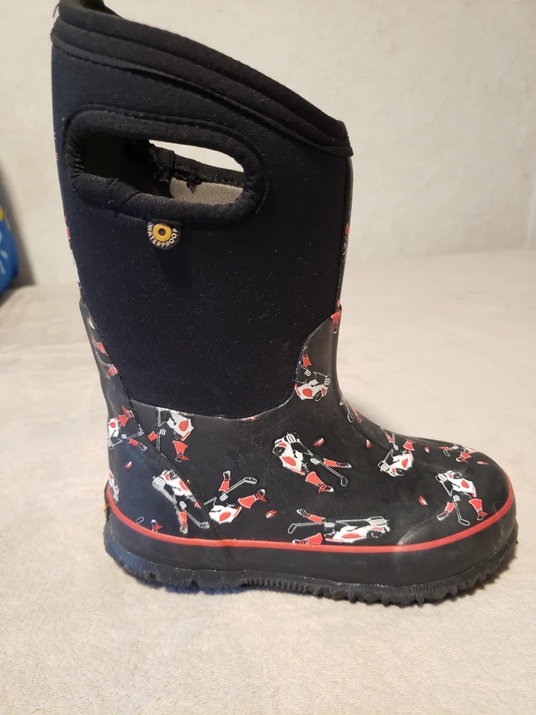 Selling a pair of Bogs Kids' Classic Hockey boots in a size 12. They feature a fun hockey player design and are perfect for keeping little feet warm and dry! These boots are durable and comfortable for all kinds of weather