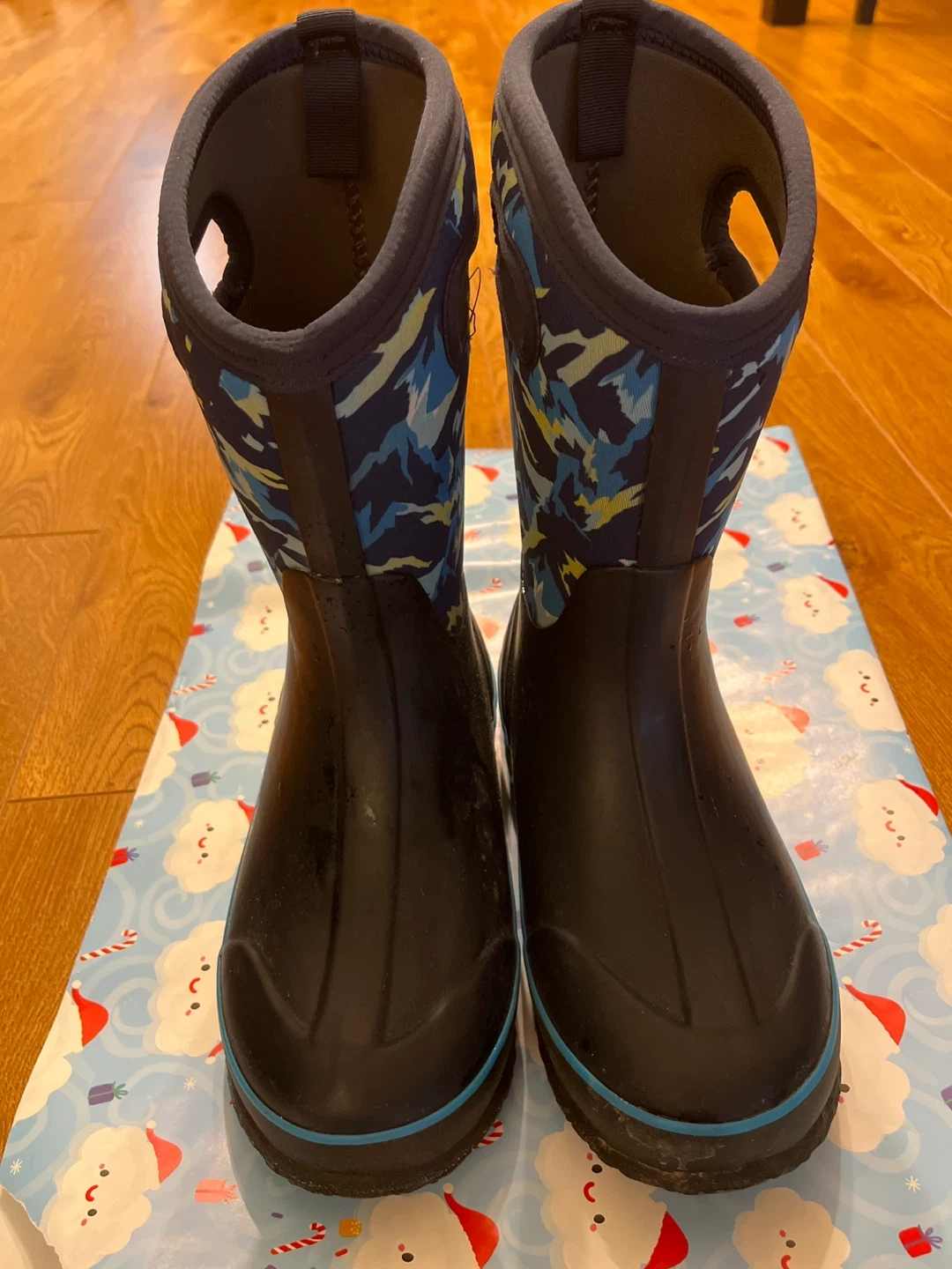 Bogs snow/rain boots in youth’s size 5! They're in great condition and perfect for puddle jumping and rainy days. The navy blue colour with a fun blue camo pattern is super cute too!