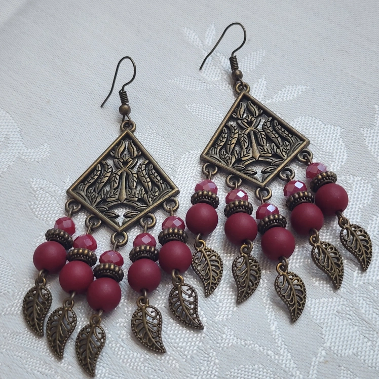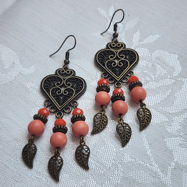 These are a fun pair of boho dangle earrings with bronze metal and colourful beads! They have a unique leaf design at the bottom. Perfect for adding a pop of colour to your outfit!