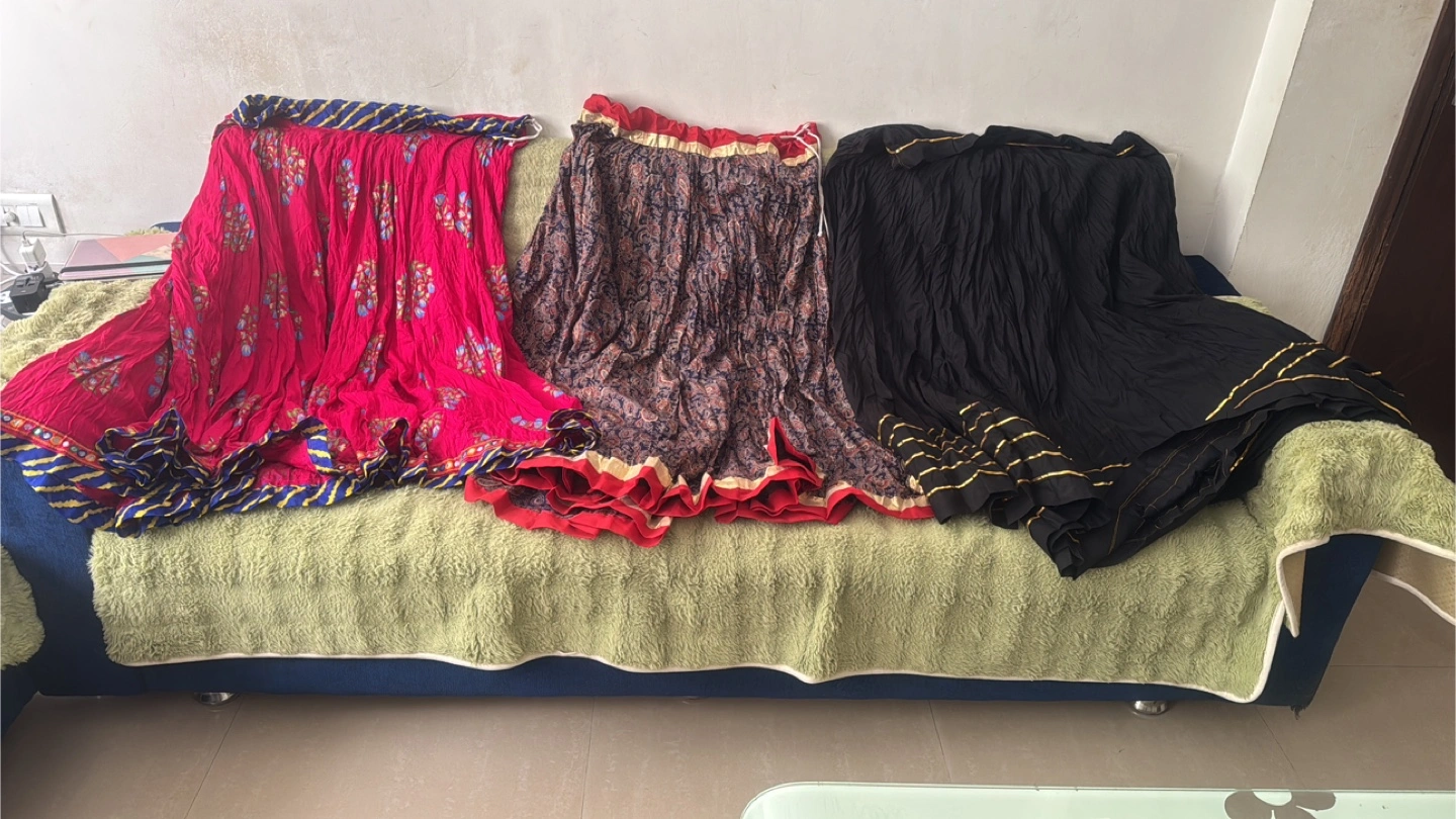 Selling a set of three boho-style skirts. One is vibrant pink with blue accents, another features a red and brown paisley pattern, and the third is classic black with gold detailing. Perfect for adding a unique touch to your wardrobe!