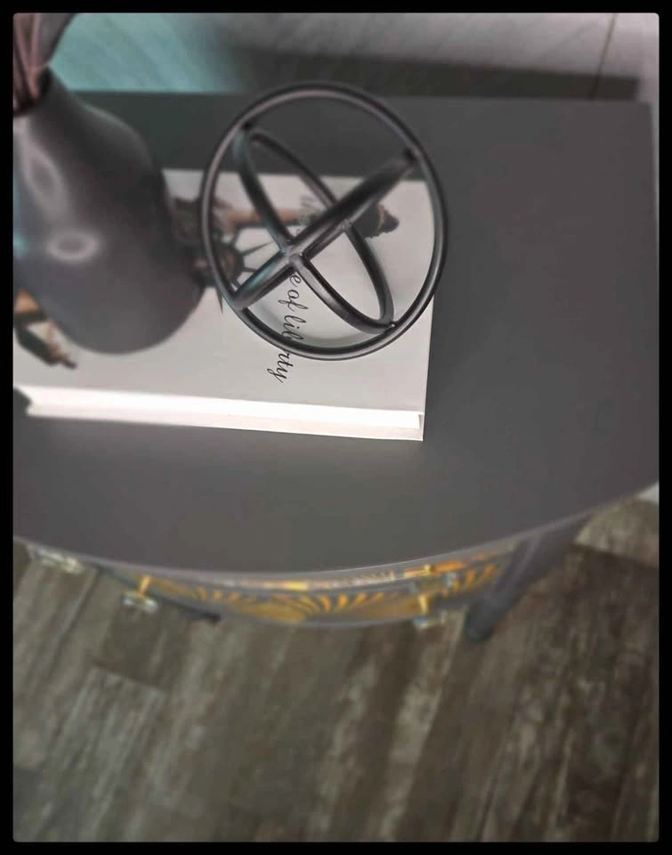 Beautifully refinished vintage accent table featuring a sleek grey finish and striking gold art deco fan details on the two drawers. It's a unique piece that adds a touch of elegance to any room. Specifications: * Colour: Grey and Gold * Number of Drawers: Two * Style: Art Deco 22.50W x 15.25D x 32.5H