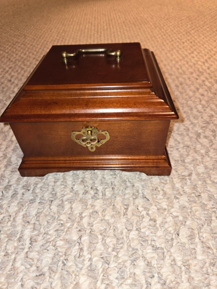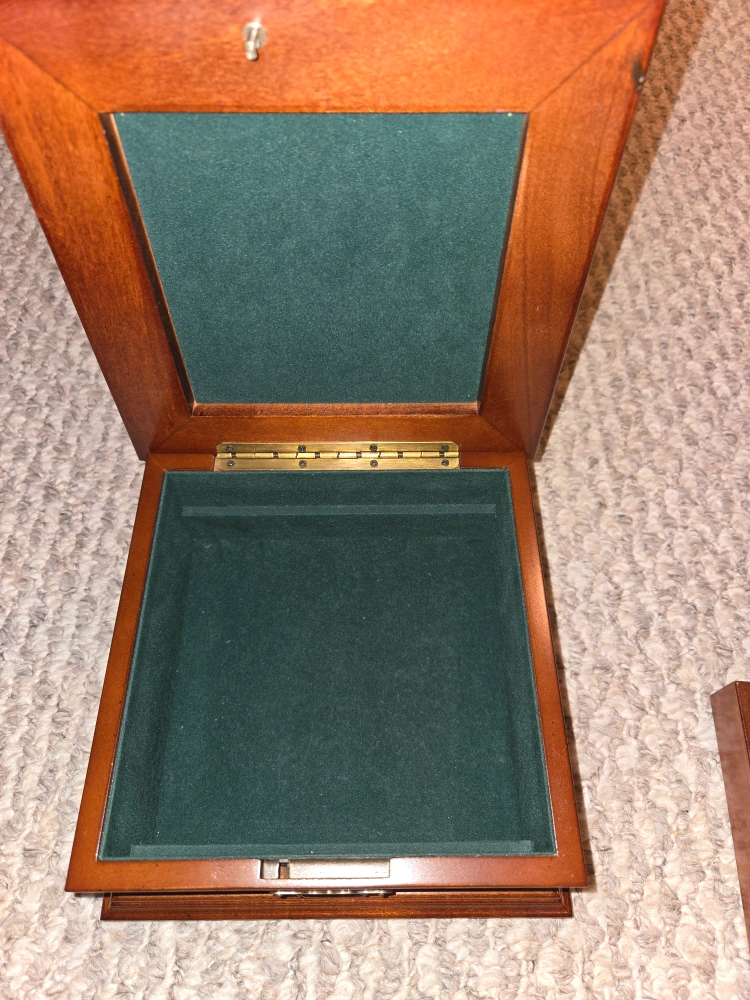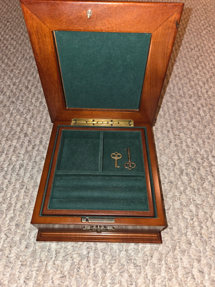 Selling a Bombay Company jewelry box. It's a lovely wooden box with a green felt interior. It also comes with two keys to keep your treasures safe and sound
