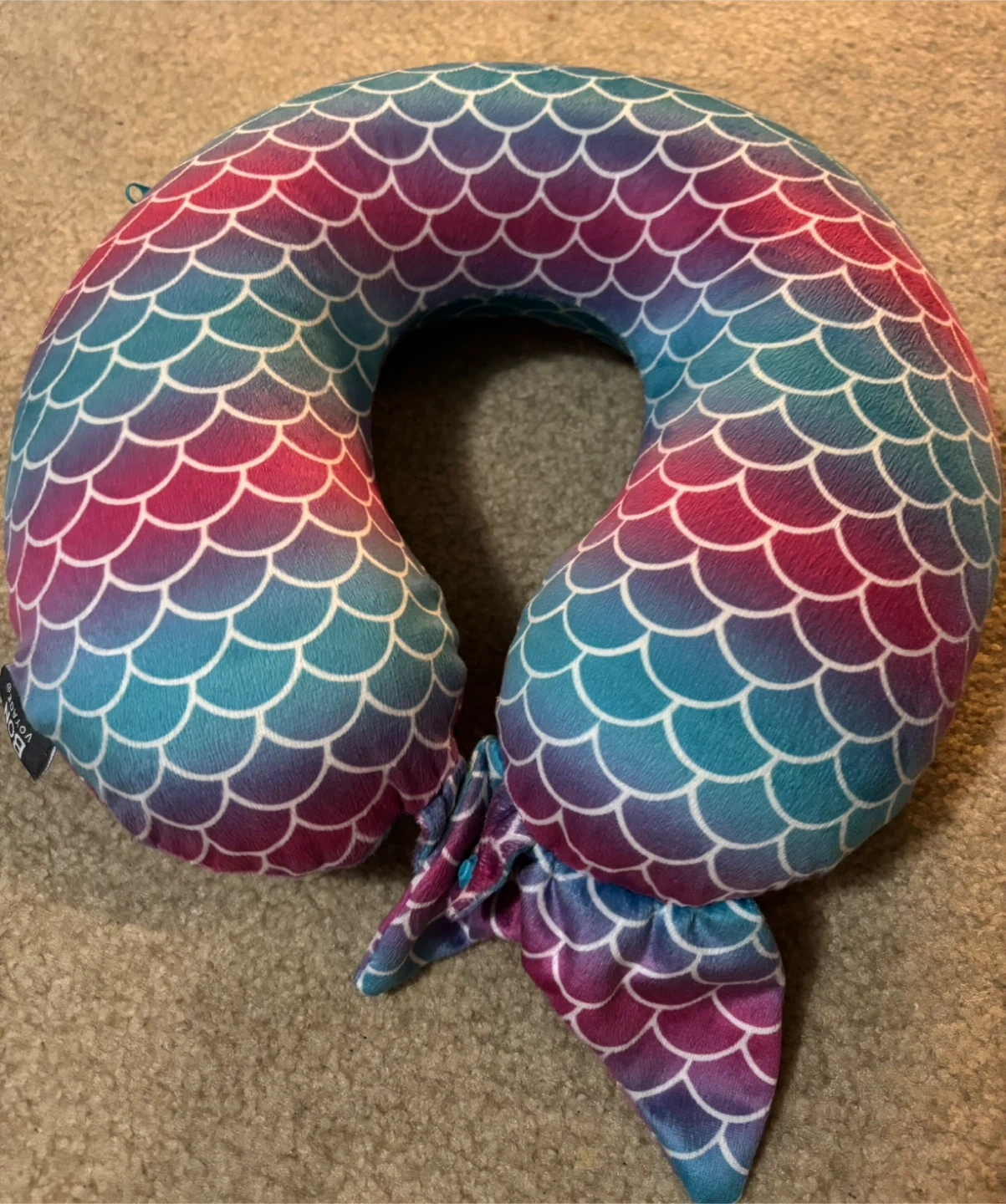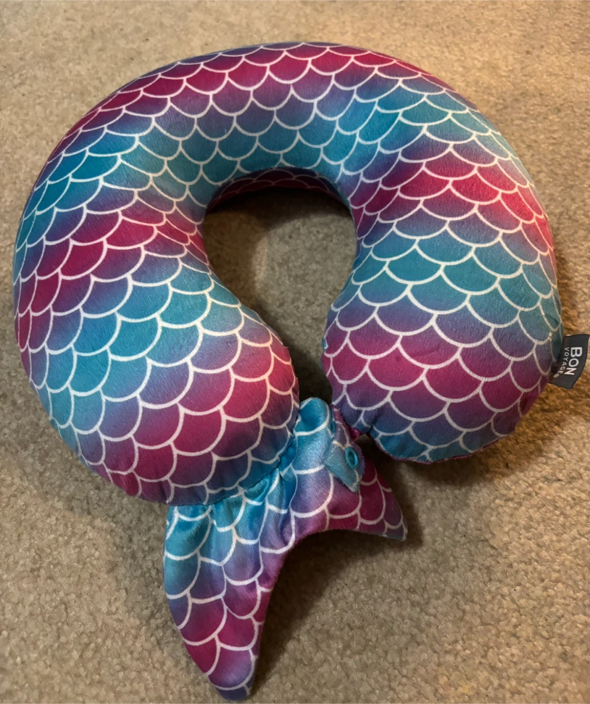 This is a Bon Voyage travel neck pillow shaped like a mermaid! It's perfect for long trips and keeping comfy. The pillow features a fun, colourful scale pattern in shades of blue, pink, and white