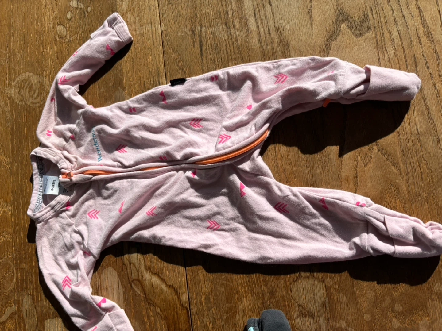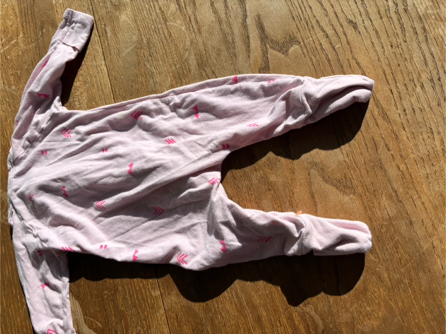 A gently used Bonds Wondersuit footed sleeper in size 0-3 months. It's a light pink colour with a cute arrow pattern. Perfect for keeping your little one cozy! (Lot 21)