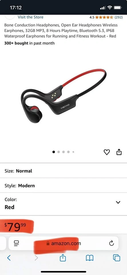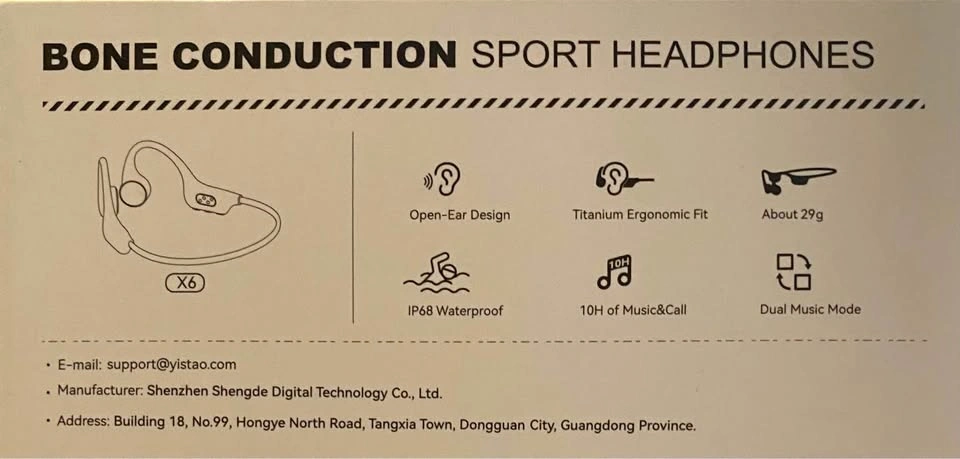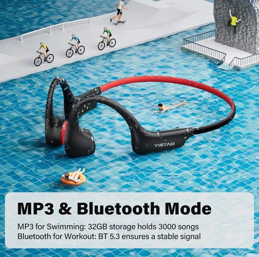 Price in picture in US $, retail in Canada is 115+ tax Have 2, Black and the other is Red. Bone Conduction Headphones, Open Ear Headphones Wireless Earphones, 32GB MP3, 8 Hours Playtime, Bluetooth 5.3, IP68 Waterproof Earphones for Running and Fitness Workout Brand Yistao Color Red Ear Placement Open Ear Form Factor Open Ear Impedance 8 Ohm Noise Control None 【 Comfortable Fit for All-Day Wear 】 Enjoy all-day wear with these 0.99 oz bone conduction headphones, featuring an adaptable titanium frame and hypoallergenic silicone for secure, irritation-free fit, compatible with sunglasses 【 Clear Sound with Acoustic Drivers 】 Enhance your listening with new bone conduction headphones, featuring a 16mm vibrator for rich audio, SoundBeam technology for privacy, and a high-frequency amplifier to reduce background noise 【 Open-Ear Design for Awareness 】 Stay alert with open ear bone conduction headphones that let you hear your surroundings, eliminating worries about missing out on crucial sounds and keeping you safe from unexpected hazards 【 Stable Connection with Bluetooth 5.3 】 Bluetooth Bone conduction headphones feature Bluetooth 5.3, offering Long-range connectivity up to 300 meters with 48Mbit/s transmission, ultra-low latency, and AAC/SBC support for premium audio quality 【 IP68 Fearless for All-Weather Use 】 Ready for any weather with the IP68 rating waterproof headphones, featuring precision sealing and hydrophobic nano-coating to keep out sweat and rain 【 32G Storage for Over 3000 Tunes 】 Utilizing a magnetic data and charging cable for PC, our sport headphones with 32GB of space can store over 3,000 songs, ensuring an uninterrupted music supply for any activity without a phone 【 8H Playtime for Long Workouts 】 Crafted for long workouts, our running headphones provide 8 hours of play on a 2-hour charge. A 10-minute quick-charge provides 3 hours of immediate use. Stay connected and energized with durable design