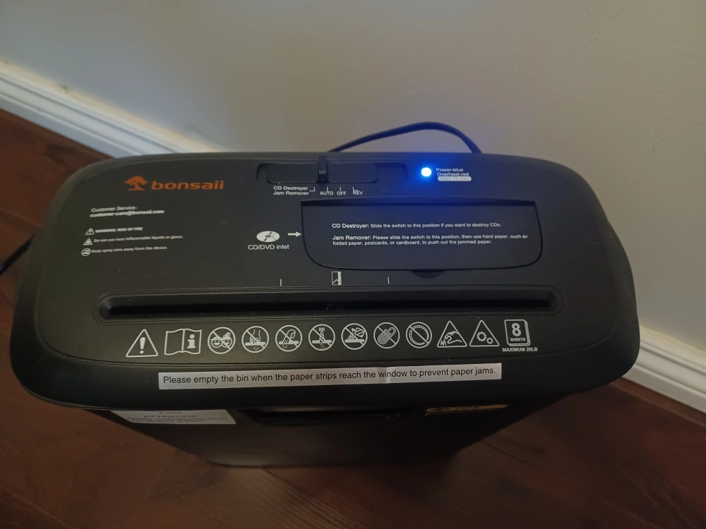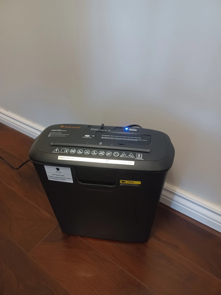 Looking to sell this Bonsaii 8-sheet StripCut shredder. It's in great shape and includes a CD Shredder Machine and an overheat protection. 3.4 Gallons Wastebasket