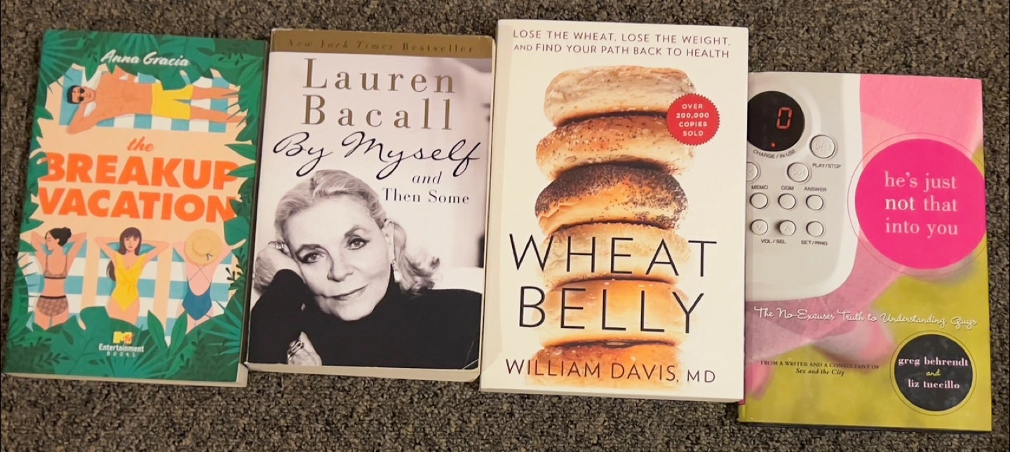 Selling a set of books including: - The Breakup Vacation by Anna Gracia - By Myself and Then Some by Lauren Bacall - Wheat Belly by William Davis, MD - He's Just Not That Into You by Greg Behrendt and Liz Tuccillo Price half of actual price