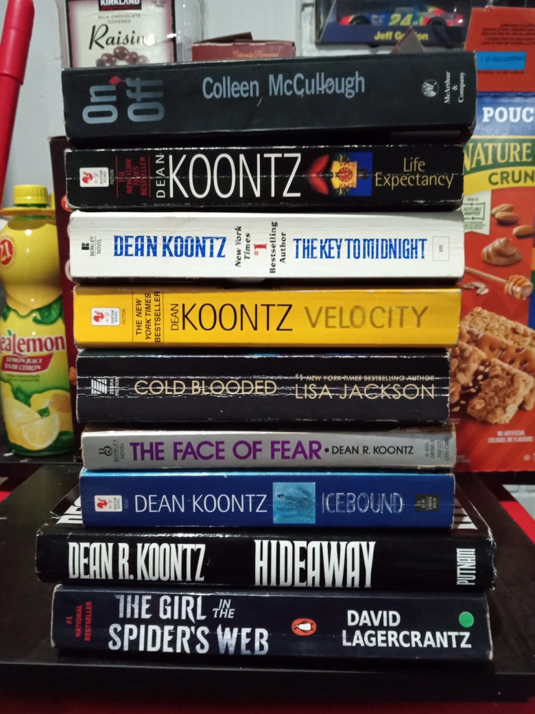 Assortment of ten used paperback books. Authors include Dean Koontz, Lisa Jackson, Colleen McCullough and David Lagercrantz. Titles include *Life Expectancy*, *The Key to Midnight*, *Velocity*, *Cold Blooded*, *The Face of Fear*, *Icebound*, *Hideaway*, and *The Girl in the Spider's Web*. Some wear and tear expected.