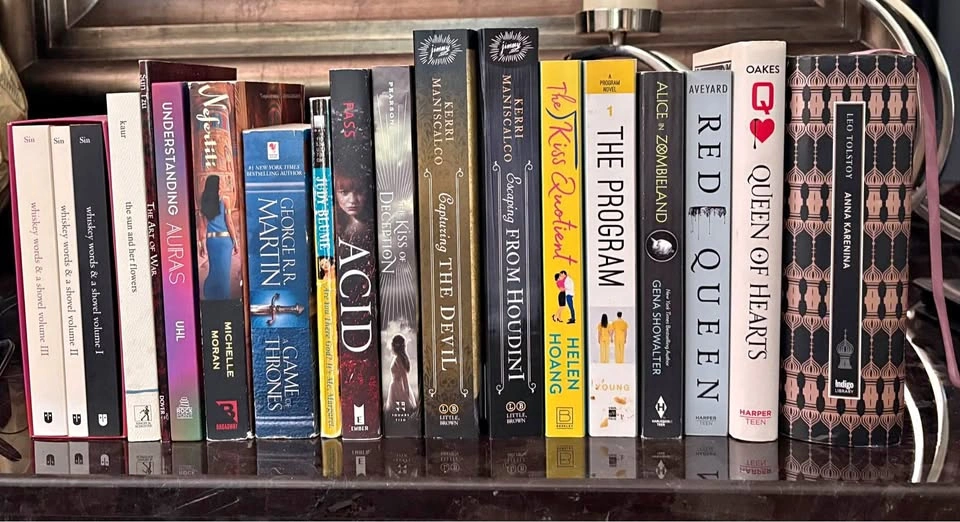 Various books for sale! $2 each or 3 for $5, unless otherwise stated below. (Open to Offers) Books are all in good condition, some better than others due to age or wear. Poetry: Whiskey Words and a Shovel Trio by R. H. Sin $10 The Sun and Her Flowers by Rupi Kaur $5 Fiction: A Game of Thrones by George R. R. Martin Anna Karenina by Tolstoy $10 Queen of Hearts by Oakes Red Queen by Aveyard Alice in Zombieland by Showalter The Program by Young Kiss of Deception by Pearson Acid by Pass Nefertiti by Moran Are You There God It’s Me Margaret by Blume The Kiss Quotient by Hoang Books 3 and 4 from Stalking Jack the Ripper: Escaping from Houdini and Capturing the Devil by Maniscalco Other: Understanding Auras The Art of War by Sun Tzu