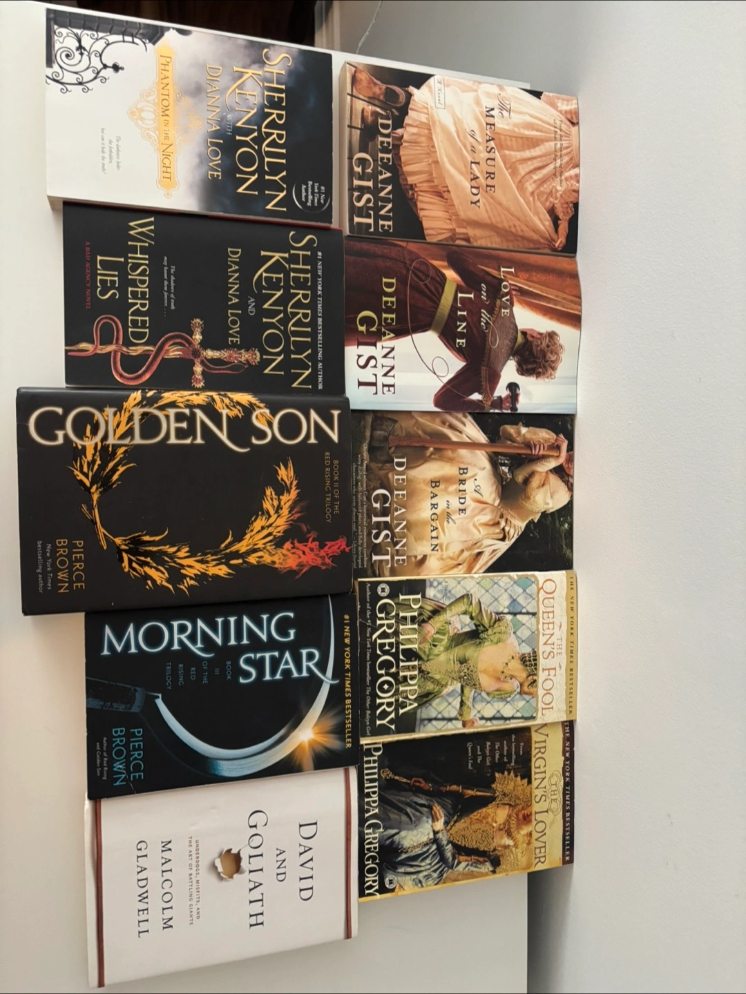 $5 each or make offer for group of books. Selling a collection of books by various authors: Sherrilyn Kenyon, Dianna Love, Deeanne Gist, Philippa Gregory, Pierce Brown, and Malcolm Gladwell Titles include: - Phantom in the Night - Whispered Lies - Golden Son - Morning Star - David and Goliath - The Queen's Fool - The Virgin's Lover - The Measure of a Lady - Love on the Line - A Bride in the Bargain
