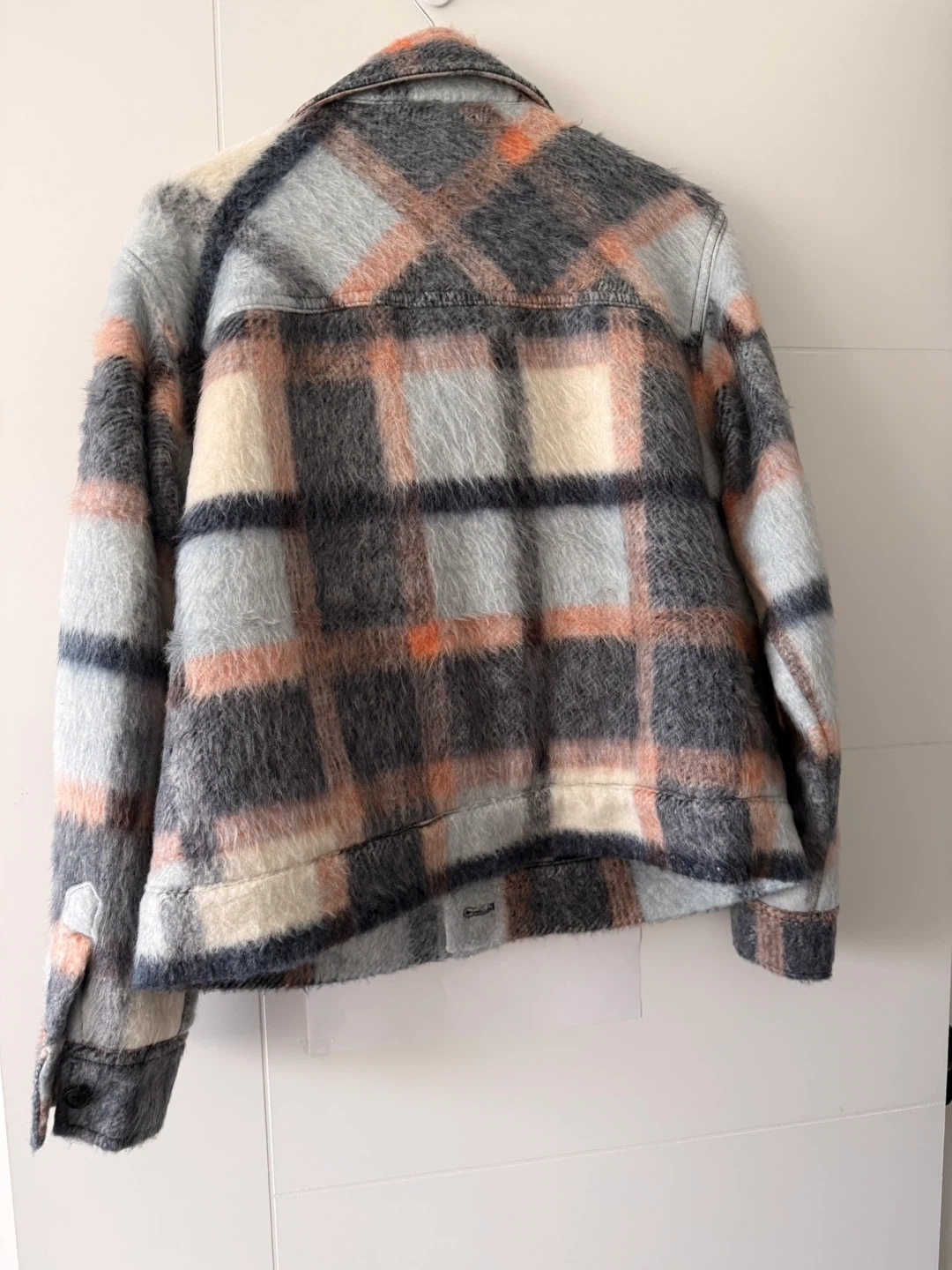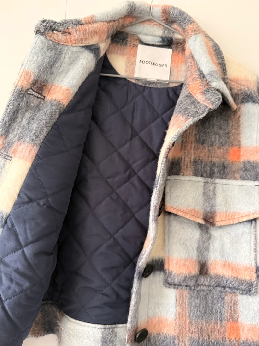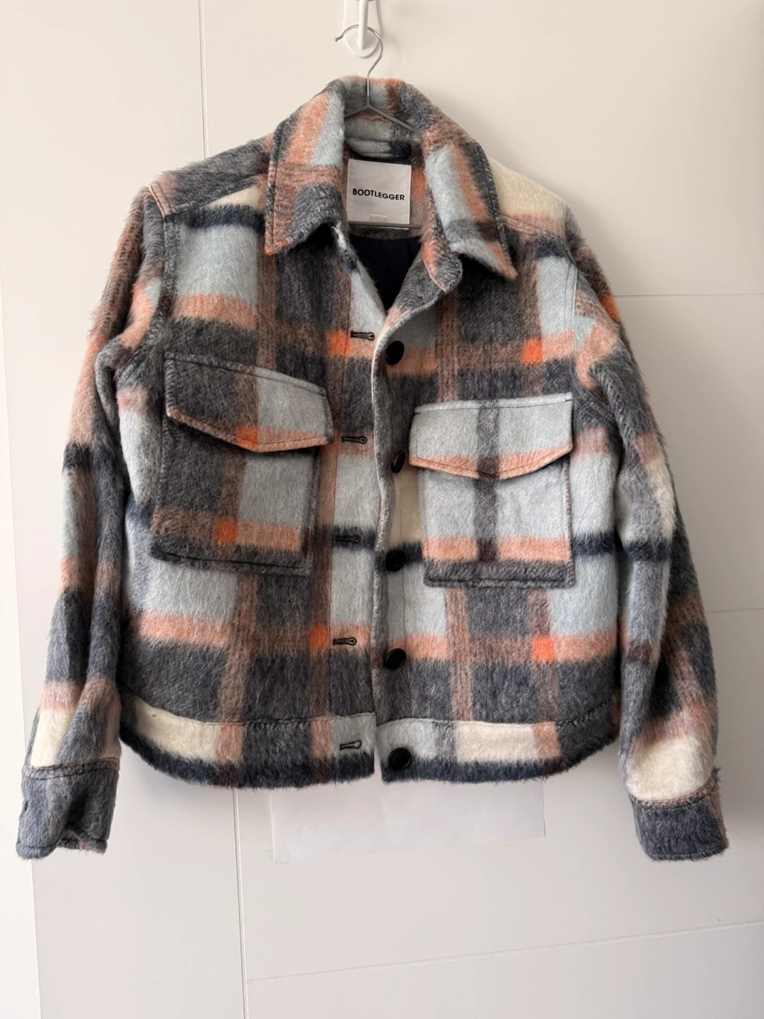 Cozy Bootlegger plaid shacket in size small. Fits more like a medium. It's brand new and ready for fall! The outer material has a soft, fuzzy texture and the inside is lined with a quilted navy fabric Never worn Pick up only Cash only