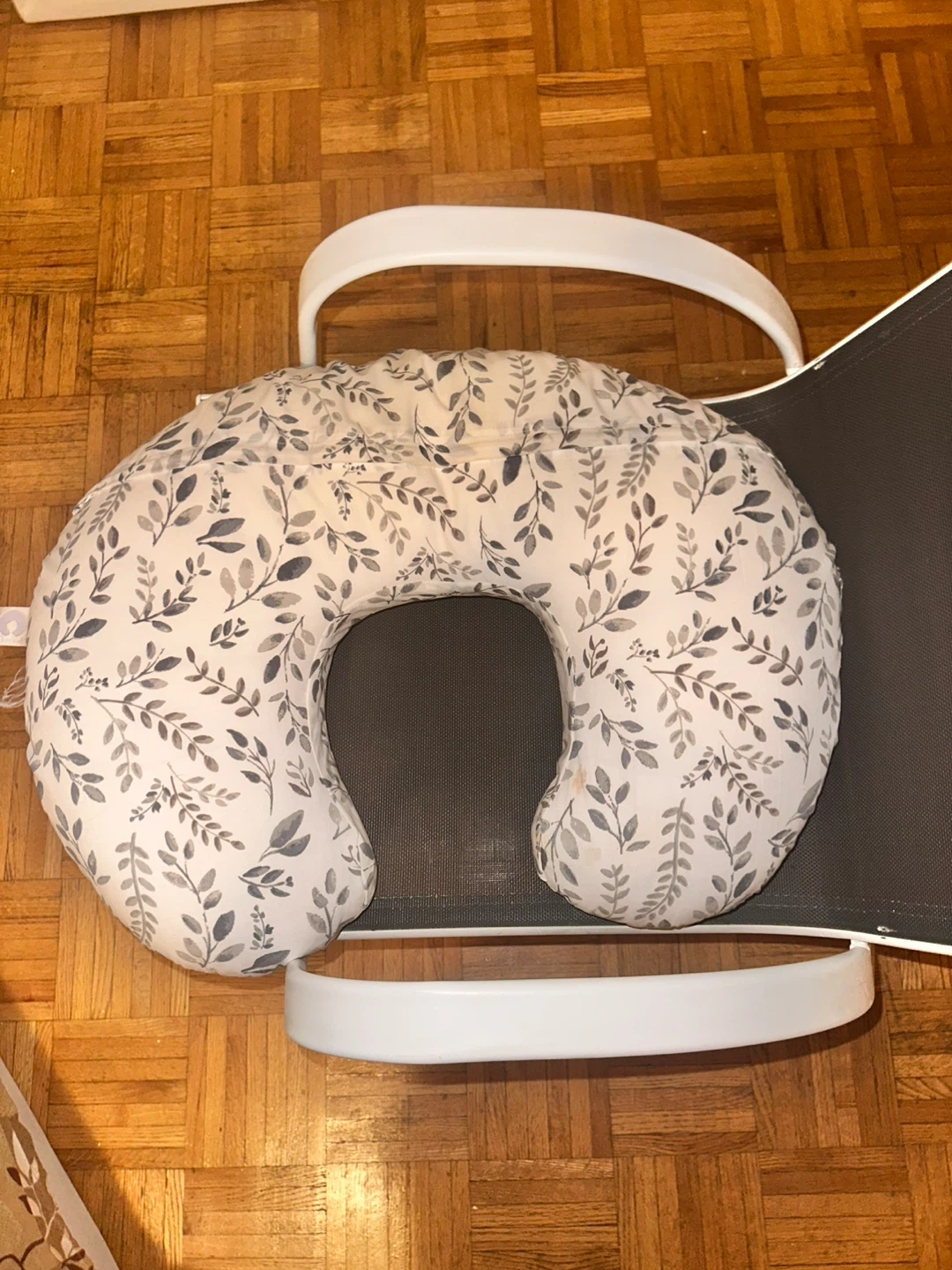 A gently used Boppy nursing pillow with a cute leaf print.