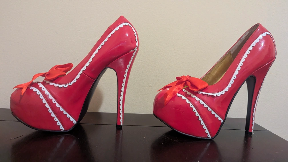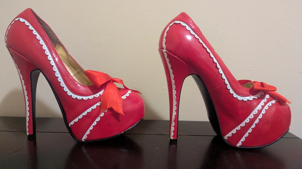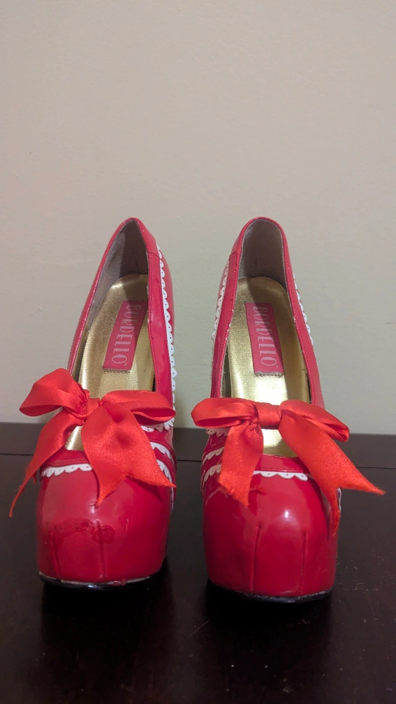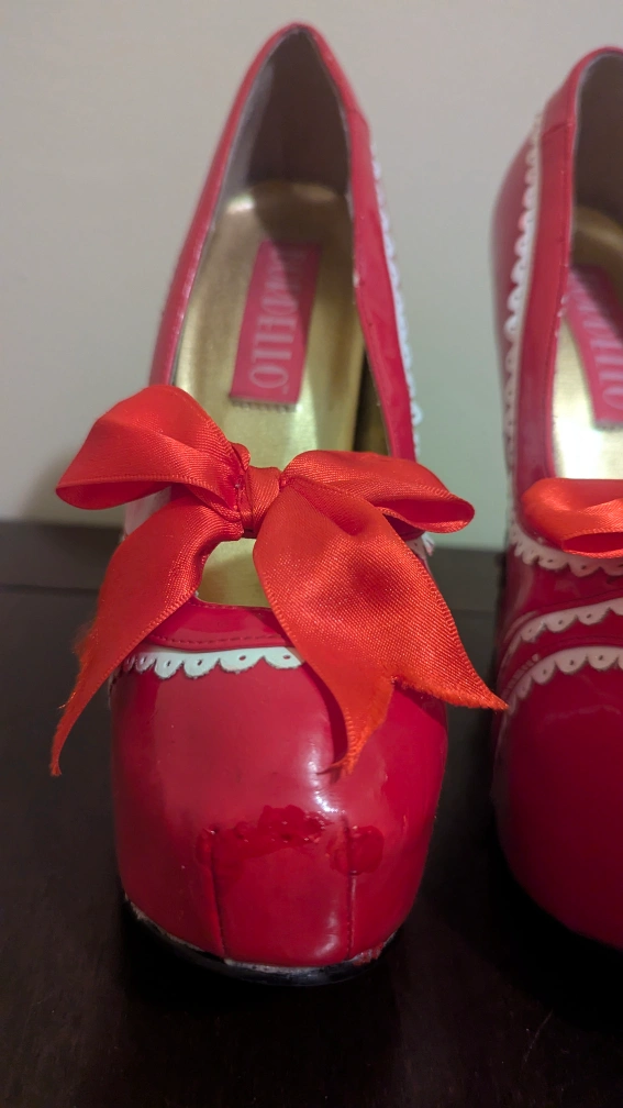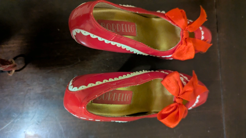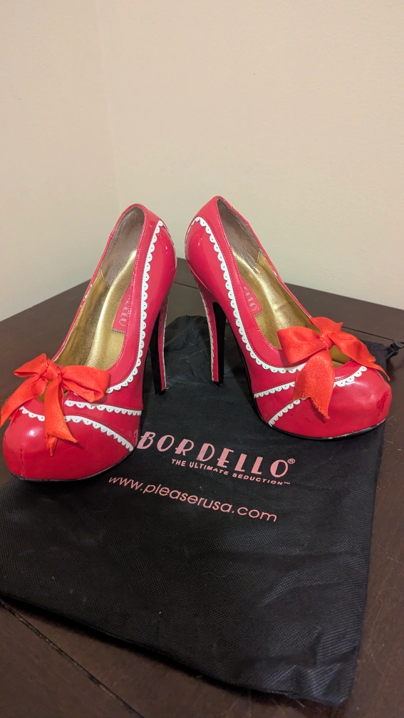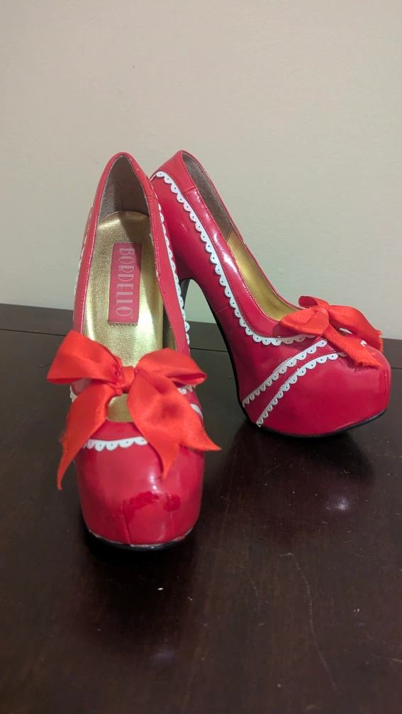 These Bordello heels are a striking red with a cute bow detail! They show some signs of wear, but are still in good condition. Perfect for adding a pop of colour to any outfit!