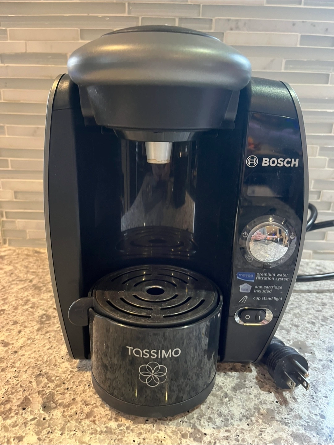 Black single-serve coffee maker. Includes one water filter cartridge. Features a cup stand light.