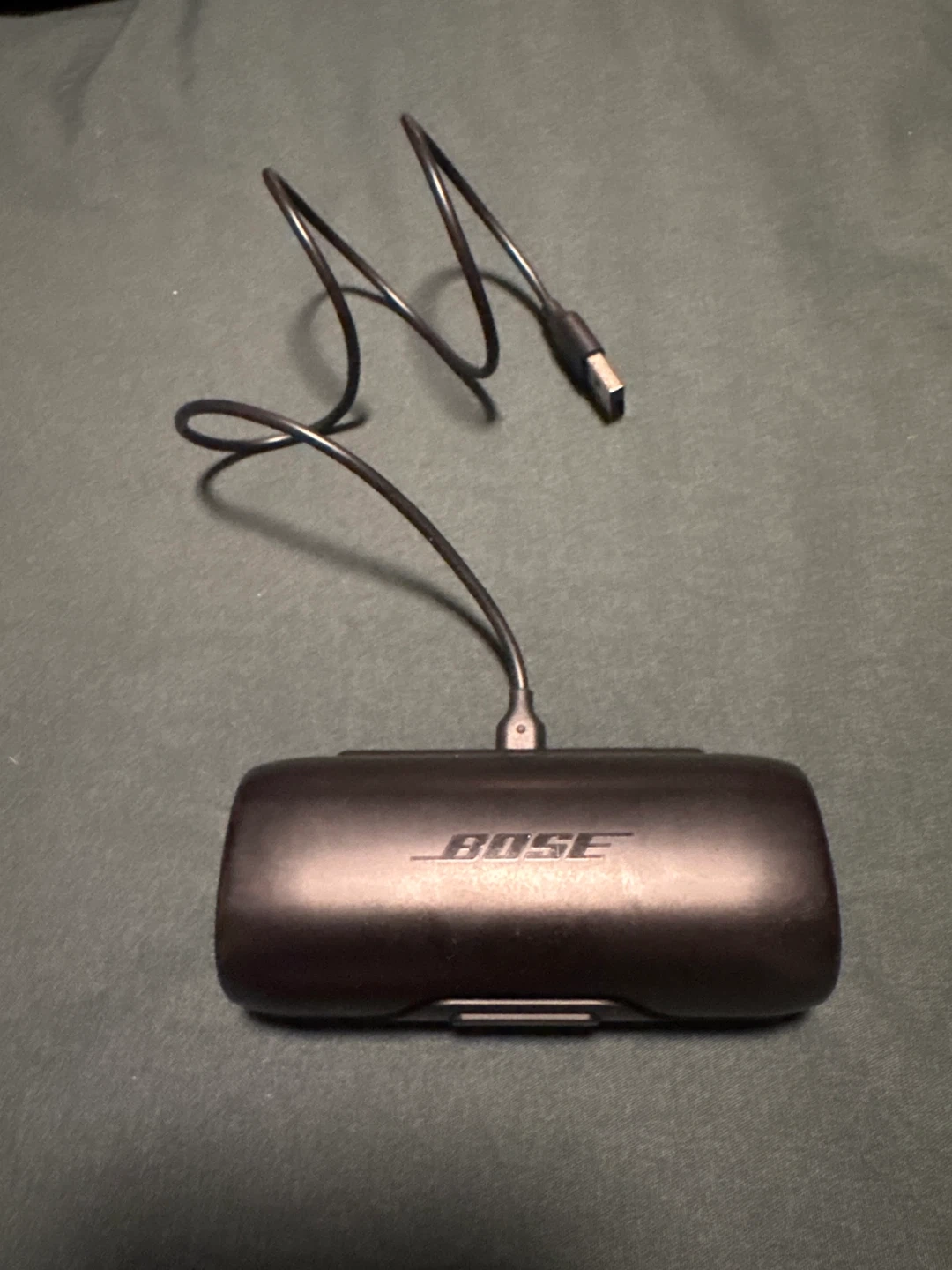 Selling a pair of Bose Sport Open Earbuds in black. They come with the charging case and cable. These earbuds are designed to stay in place during workouts and provide high-quality audio while allowing you to hear your surroundings. Great for running or any outdoor activity!