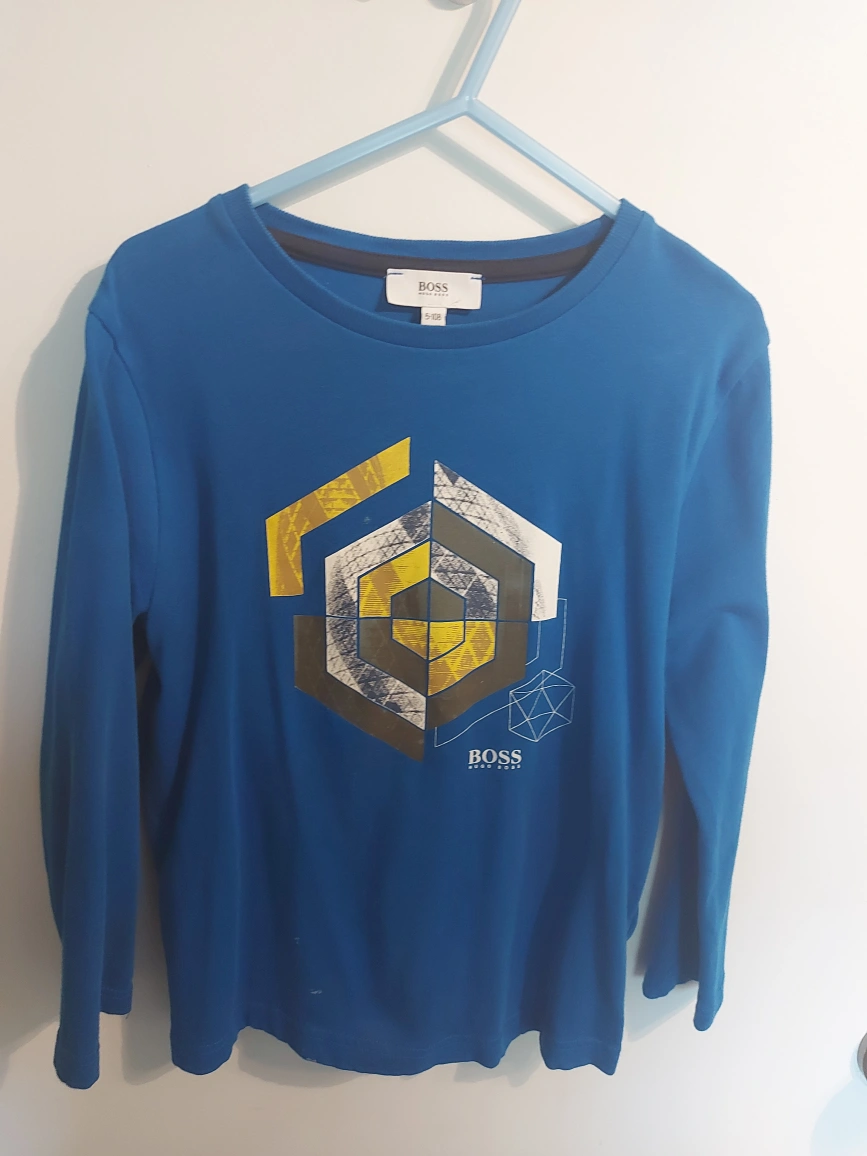 Selling a blue long-sleeve shirt from BOSS! It's a size 5-108 and features a cool geometric design on the front. Great for layering or wearing on its own