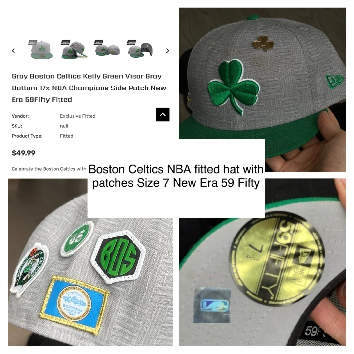 Selling a Boston Celtics NBA fitted hat by New Era! It's a 59Fifty style, size 7 3/4. The hat is gray with a Kelly green visor and has a 17x NBA Champions side patch. It also has a few other patches stitched on!