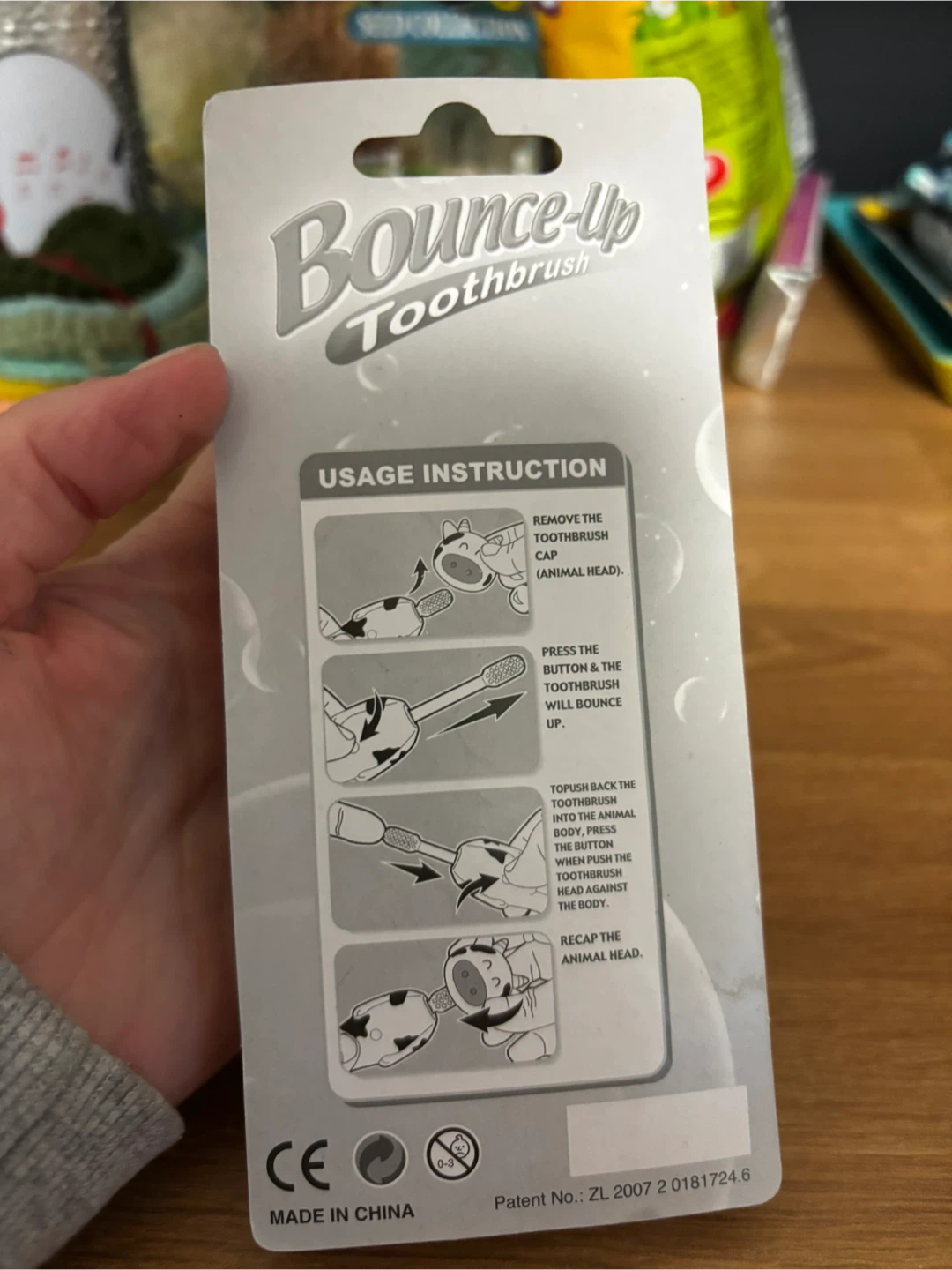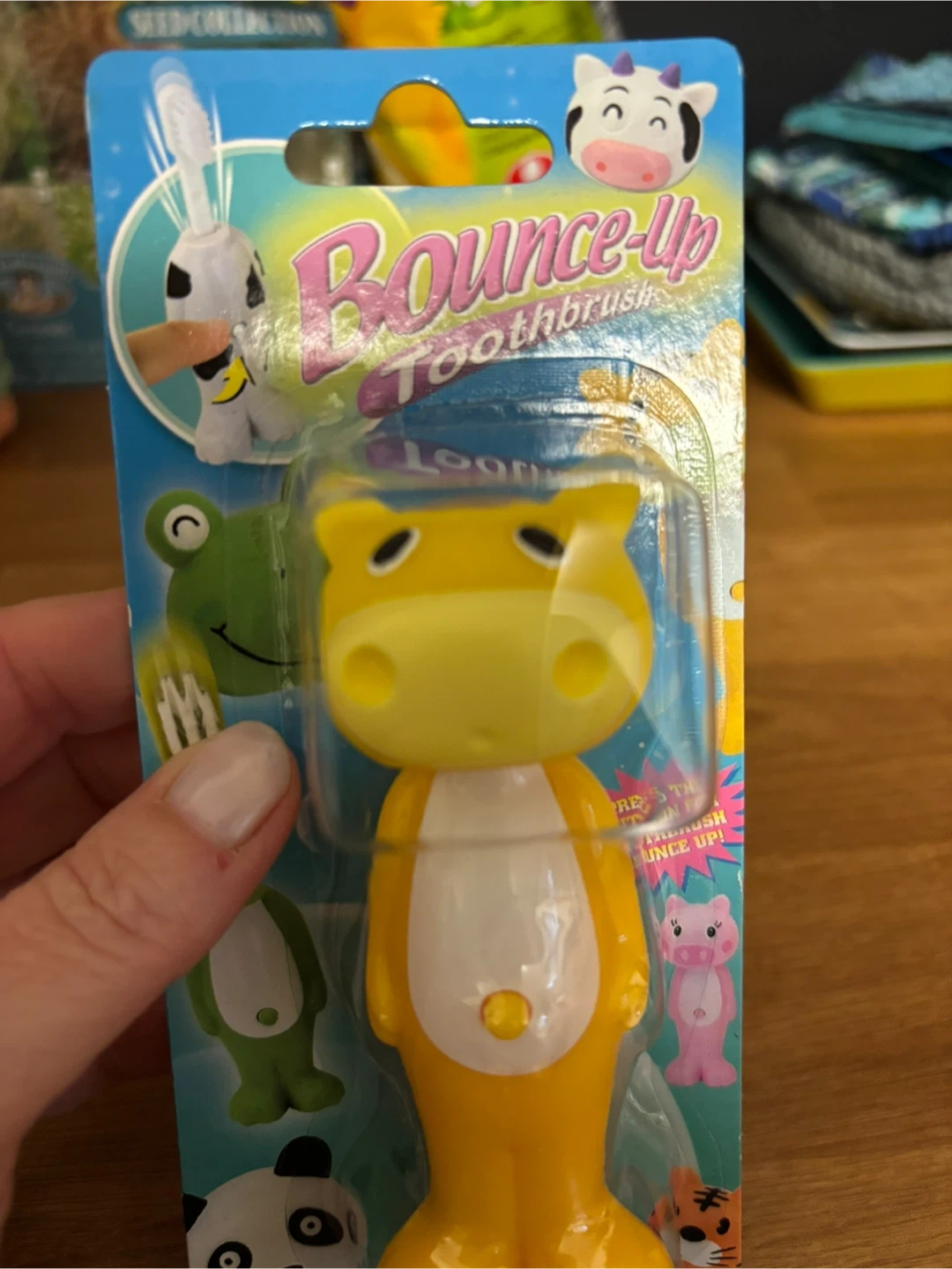Free with purchase brand new Bounce-Up Toothbrush! It's a fun and engaging way to encourage kids to brush their teeth. The toothbrush features a yellow hippo design and is suitable for ages 3 and up. Check out the usage instructions on the back of the packaging for a quick guide on how to use it