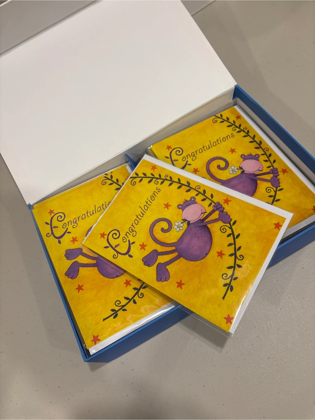Selling a box of cute congratulations cards with white envelope .They feature a purple monkey design on a yellow background. Perfect for any celebratory occasion.