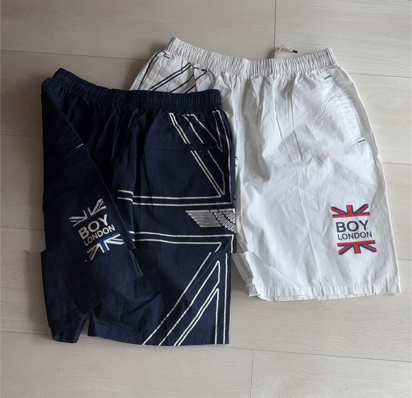 Two pairs of Boy London shorts up for grabs! One pair is navy with white accents, and the other is white with the iconic Boy London logo. Both are in great shape and ready for a new home!