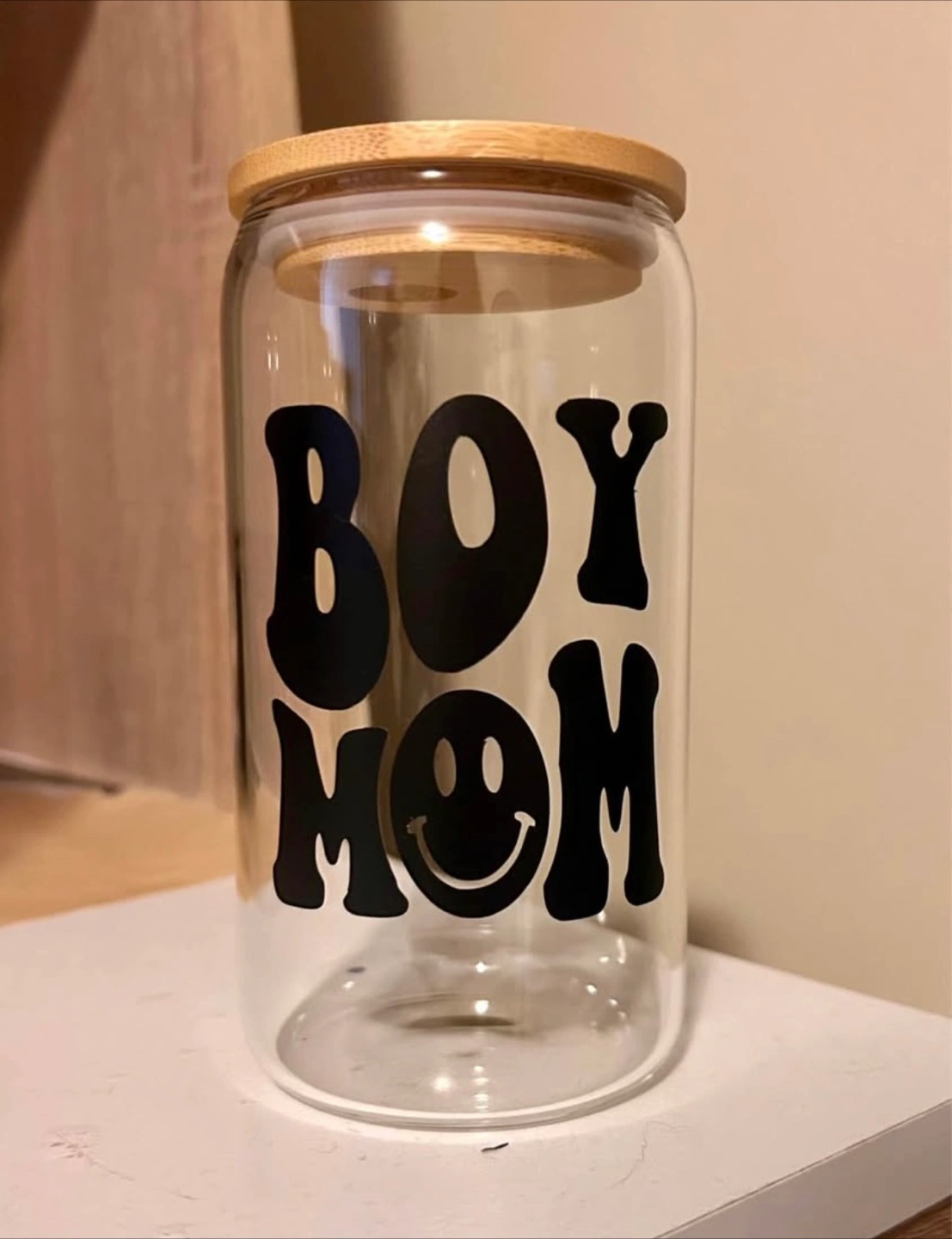 Here's a cute glass tumbler with a bamboo lid. It has the words 'Boy Mom' printed on the side with a smiley face. Perfect for your favourite beverage! Comes with glass straw. Hand wash only. Do not soak.